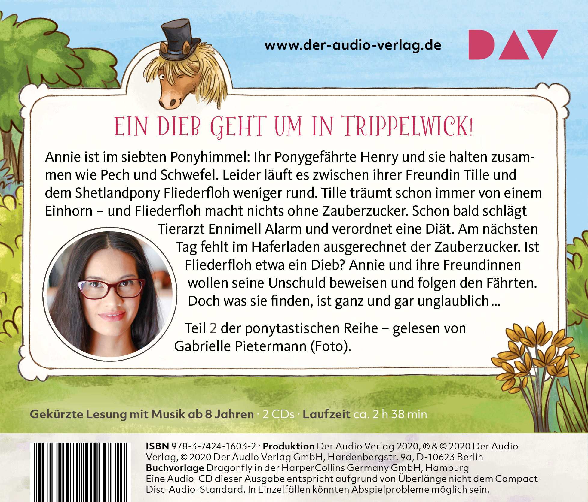 Annelie ist überglücklich. Das wunderschöne Pony Henry hat sich am Gefährtentag für sie entschieden! Leider läuft es bei ihrer Freundin Tille nicht so gut wie bei Henry und ihr, denn Tilles Shetlandpony Fliederfloh macht nichts ohne Zauberzucker. Dabei hat sich Tille doch so sehr ein Einhorn gewünscht! Weil Fliederfloh durch den vielen Zauberzucker immer dicker wird, verordnet der Tierarzt Ennimell eine Diät. Als dann am nächsten Tag im Haferladen ausgerechnet der Zauberzucker verschwunden ist, wird natürlich Fliederfloh für den Dieb gehalten. Annelie und Tille wollen seine Unschuld beweisen und folgen den Spuren, aber was sie finden, ist unglaublich ...Lesung mit Gabrielle Pietermann2 CDs | ca. 2 h 38 min