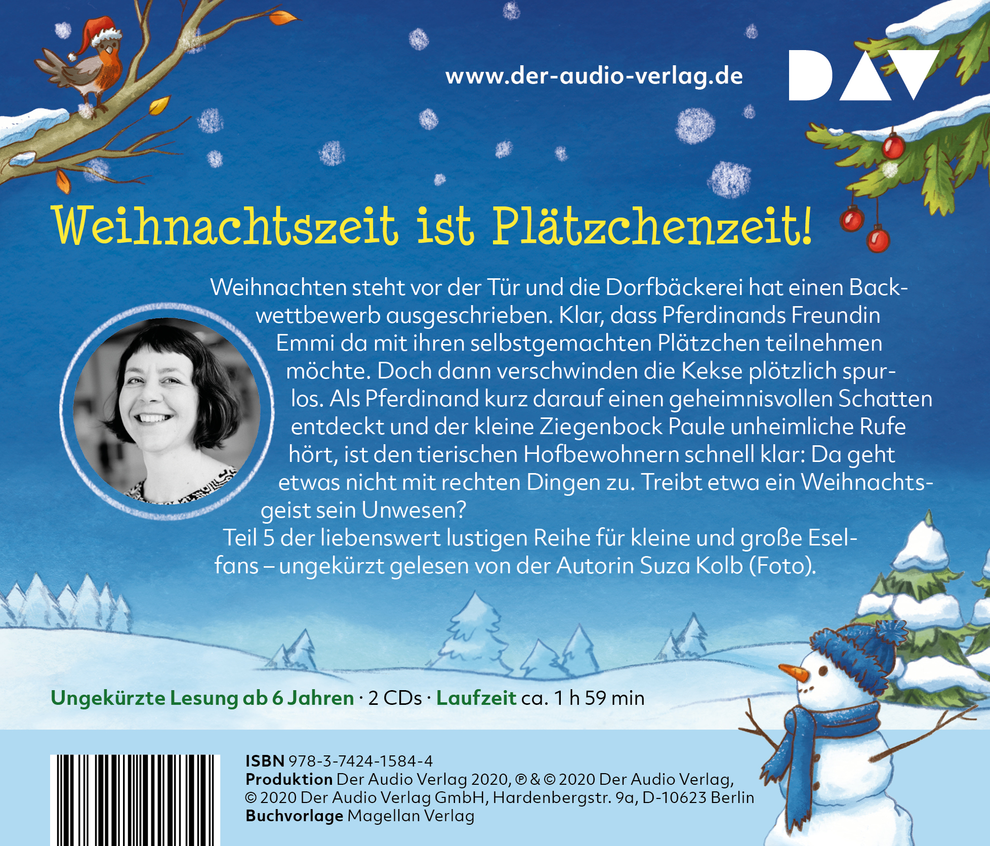 Weihnachtszeit ist Plätzchenbackzeit! Besonders, wenn die Dorfbäckerei einen Backwettbewerb ausgeschrieben hat. Emmi und Lenni wollen mit ihren selbstgebackenen Plätzchen mitmachen - und natürlich gewinnen. Aber dann verschwinden die Plätzchen, die nur kurz zum Abkühlen auf der Terrasse standen, plötzlich spurlos. Spätestens als Pferdinand auch noch ein dunkles Gesicht am Fenster entdeckt und der kleine Ziegenbock Paule ein unheimliches Rufen hört, ist allen klar, dass etwas nicht mit rechten Dingen zugeht. Treibt etwa ein Weihnachtsgeist sein Unwesen?Ungekürzte Autorinnenlesung mit Suza Kolb2 CDs | ca. 1 h 59 min