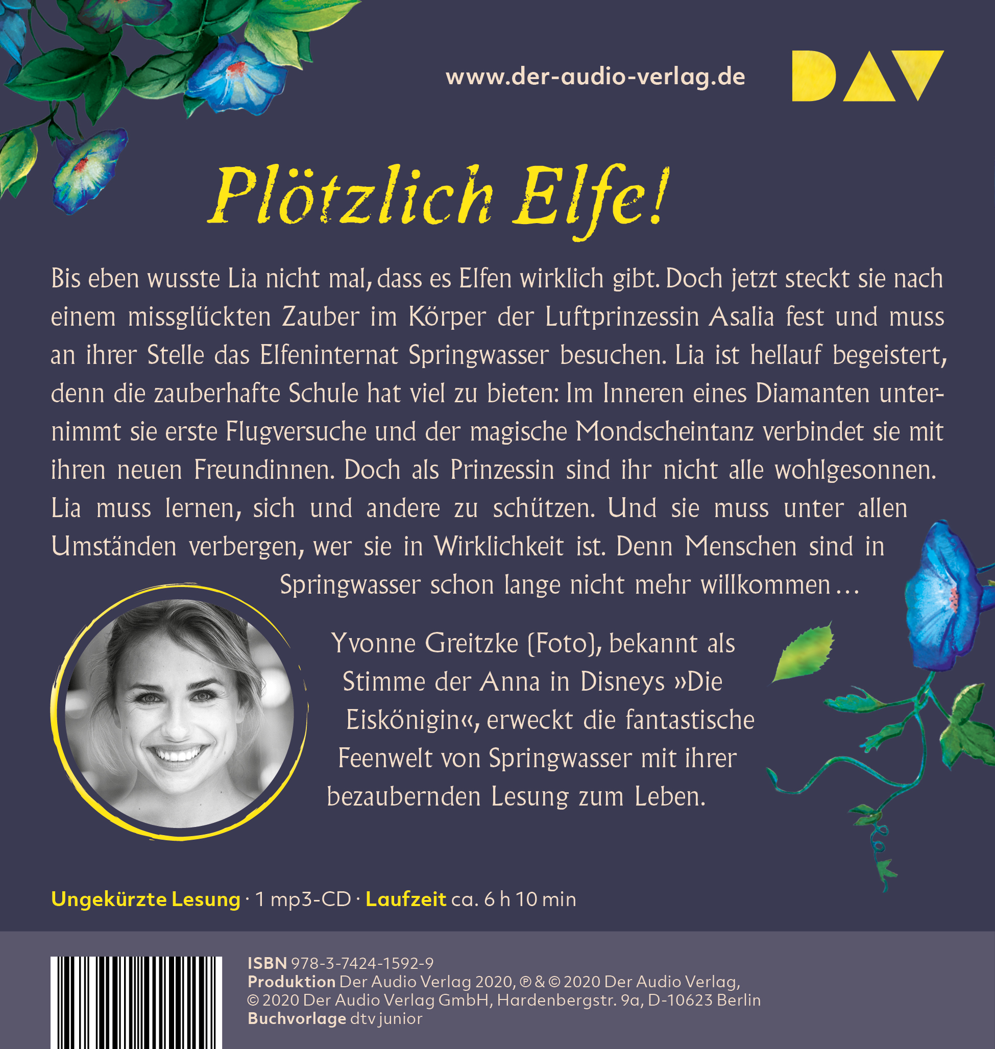 Bis eben wusste die elfjährige Lia nicht einmal, dass es Elfen gibt. Doch nach einem missglückten Zauber steckt sie plötzlich im Körper der Luftprinzessin Asalia fest und muss an ihrer Stelle das Elfeninternat Springwasser besuchen. Lia ist hellaufbegeistert, denn die zauberhafte Schule hat viel zu bieten: Im Inneren eines Diamanten unternimmt sie erste Flugversuche und der magische Mondscheintanz verbindet sie mit ihren neuen Freundinnen. Doch als Prinzessin sind ihr nicht alle wohlgesonnen. Lia muss lernen, sich und andere zu schützen. Und sie muss verbergen, dass sie ein Mensch ist, denn die haben in Springwasser nichts verloren!Ungekürzte Lesung mit Yvonne Greitzke1 mp3-CD | ca. 6 h 10 min