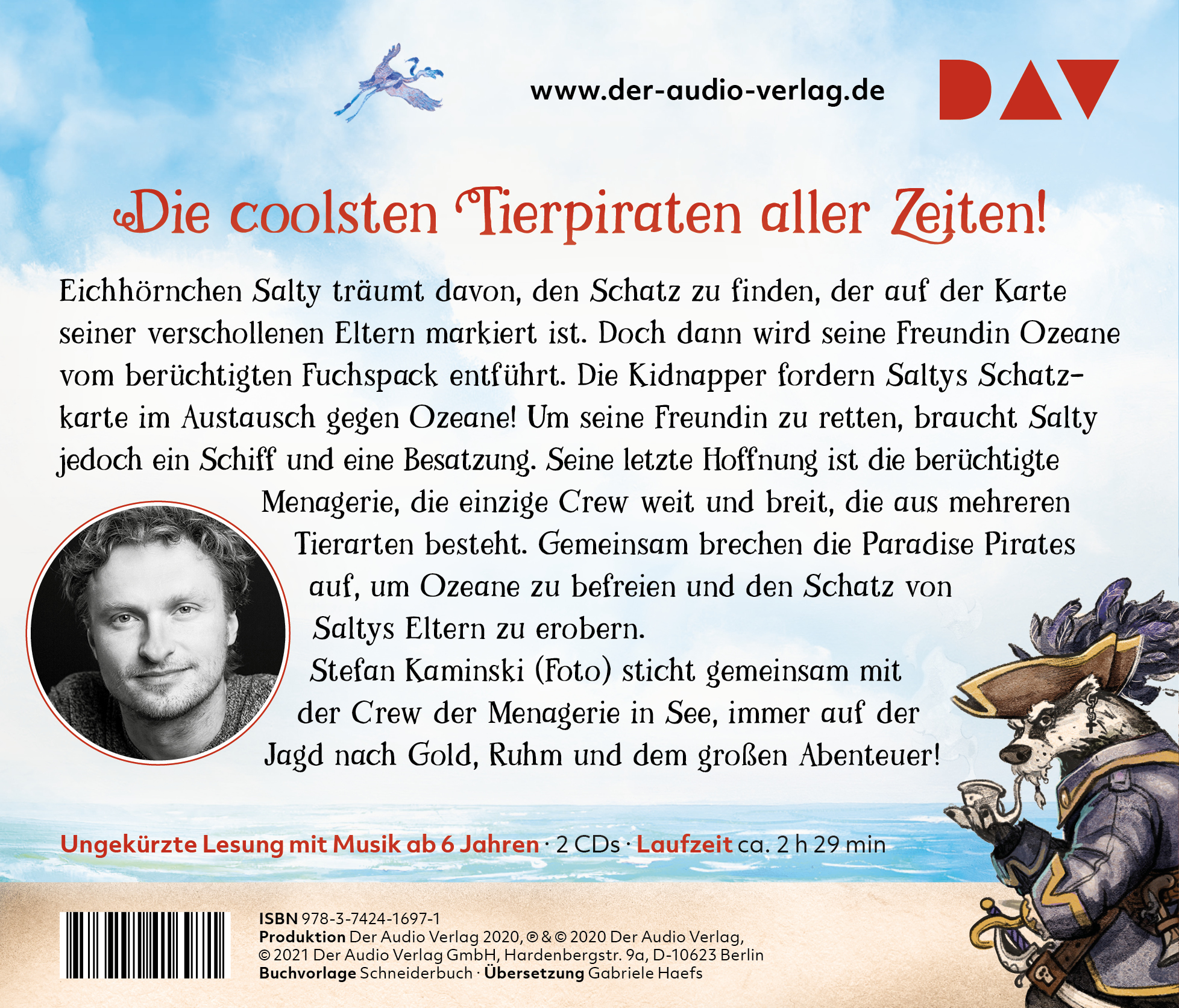 Eichhörnchenjunge Salty träumt davon, eines Tages den Schatz zu suchen, der auf der Karte seiner verschollenen Eltern markiert ist. Doch dann wird seine Freundin Ozeane von einer Crew aus Füchsen entführt. Sie fordern Saltys Schatzkarte im Austausch gegen Ozeane! Ihm bleiben drei Tage, um seine Freundin zu retten. Dafür braucht Salty jedoch ein Schiff und eine Besatzung, die es mit dem Fuchspack aufnehmen kann. Seine Hoffnung ist die berüchtigte Menagerie, die einzige Crew weit und breit, die aus mehreren Tierarten besteht. Gemeinsam machen sich die Paradise Pirates auf, Ozeane zu befreien und den Schatz von Saltys Eltern zu finden.Ungekürzte Lesung mit Musik mit Stefan Kaminski2 CDs | ca. 2 h 29 min