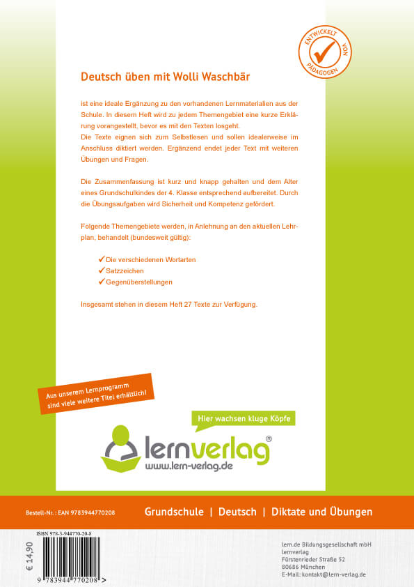 | Schlagworte | Das Probenbuch 4. Klasse Deutsch • Deutsch Lernhilfe Grundschule • Deutsch Übertritt • Grundschule 4 • Grundschule Diktatbuch • Grundschule Klasse 4 Wortarten • Grundschule Lernwörter Klasse 4 • Grundschule Lesetexte • Homeschooling • Leistungsfeststellung • Lernhilfe Deutsch • Lernwörter Klasse 4 • Lesehilfe Deutsch 4 • Training Deutsch Klasse 4 • Vera 4 • Wolli Waschbär |