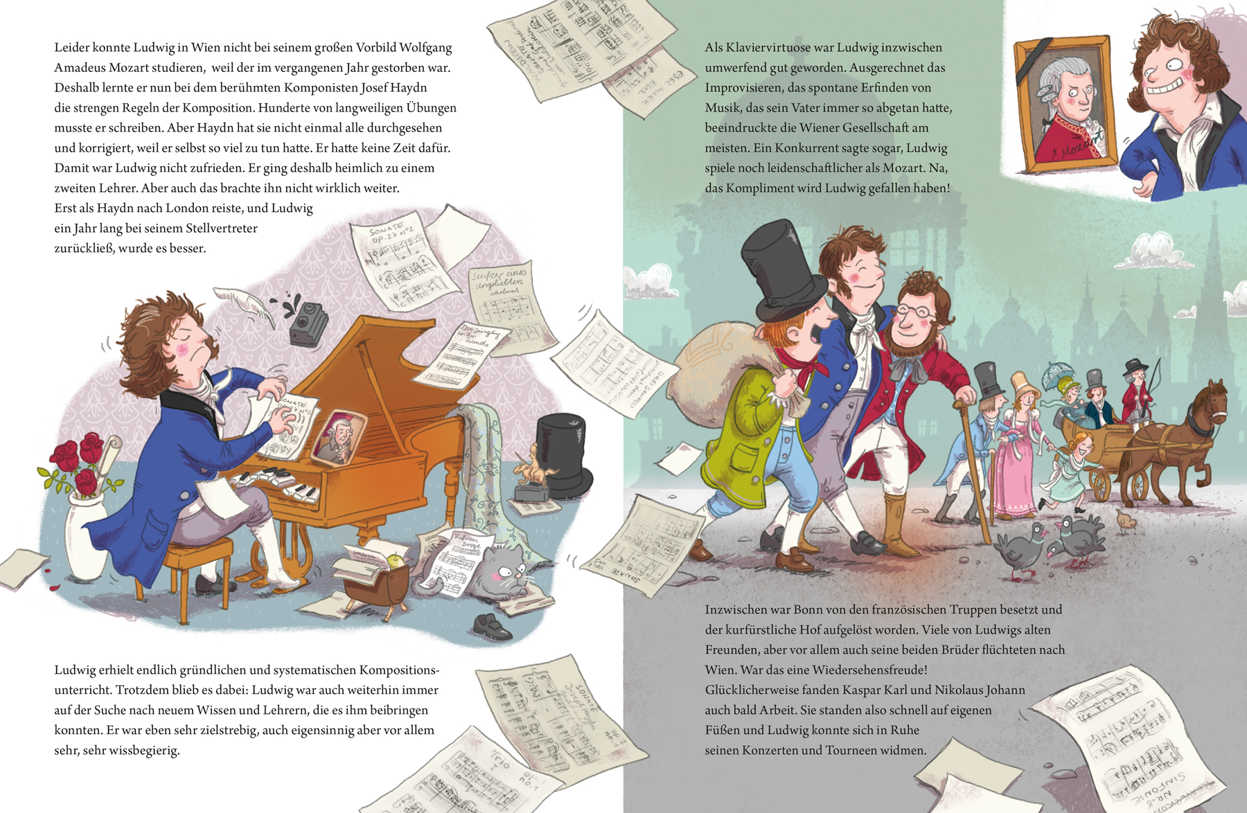 Warum wurde der kleine Ludwig auch der »Spanier« genannt? Warum tobte er lieber mit seinen Freunden herum und warum konnte sein strenger Vater das mit der »Wunderkind-Karriere« getrost vergessen? Davon und noch von vielen anderen spannenden Dingen,erzählt diese vergnügliche Bilderbuchgeschichte über das Leben des weltberühmten Komponisten Ludwig van Beethoven. Fröhliche Illustrationen von Barbara Scholz zur Historie aber auch lustige Details aus dem Alltag Beethovens machen anschaulich, wie mühsam so ein Musikerleben damals war. Und wer weiß schon, dass Beethoven gerne Kaffee trank und genau 60 Bohnen pro Tasse das richtige Maß für ihn waren?