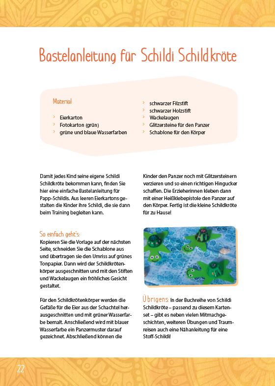 | Schlagworte | Achtsamkeit • Bewegung • Bewegungskarten • Bildkarten • Entspannung • Entspannungstherapie • Erzieherin • Erzieherinnen • Fotokarten • KiGa • Kinder • Kindergarten • Kinesiologie • Kita • Konzentration • Lernblockaden • Lerntherapie • Mitmachgeschichten • Resilienz • Schildi Schildkröte • Verspannungen |