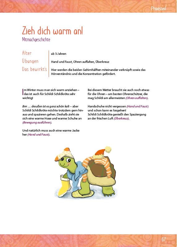 Entspannte Kinder - mehr Konzentration! Ein kniffliges Puzzle lösen oder sich ganz in einem Buch verlieren - damit man sich länger gut auf etwas konzentrieren kann, müssen Stress und überschüssige Energien abgebaut werden. Am besten geht das mit Bewegung!Mit den speziellen Haltungen und Übungsabfolgen aus Yoga und Kinesiologie in Schildi Schildkröte konzentriert sich gelingt es den Kindern, einer Sache ihre volle Aufmerksamkeit zu schenken.In 40 Geschichten, Gedichten und Liedern zum Mitmachen werden die Übungen spielerisch angewendet und sorgen so für Entspannung und innere Ruhe.Ob Profi oder Neuling - durch detaillierte Anleitungen und viele Praxisfotos fällt der Einstieg leicht.