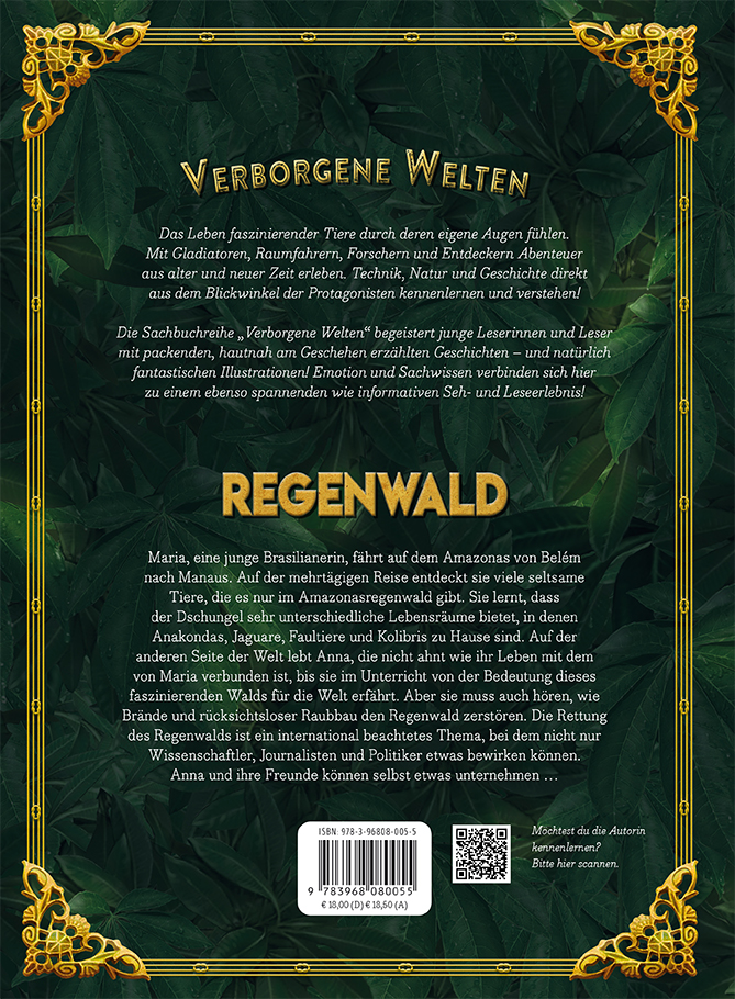 Der Amazonasregenwald ist so riesig, dass man es sich kaum vorstellen kann. Das Buch entführt Kinder in die geheimnisvolle Welt dieses Dschungels. Die Leserinnen und Leser erleben Abenteuer aus Sicht eines Flussdelfins, Jaguars oder Faultiers, begleiten den großen Forscher Alexander von Humboldt auf seine berühmte Expedition, erleben die geschäftige Regenwaldmetropole Manaus oder erhalten Einblicke in den Alltag indigener Völker. Nicht zuletzt geht es auch um den Schutz der Regenwälder. Warum sind sie für unsere Erde so wichtig? Warum brennen immer wieder riesige Waldflächen ab? Und was können Kinder in ihrem Alltag dagegen tun?