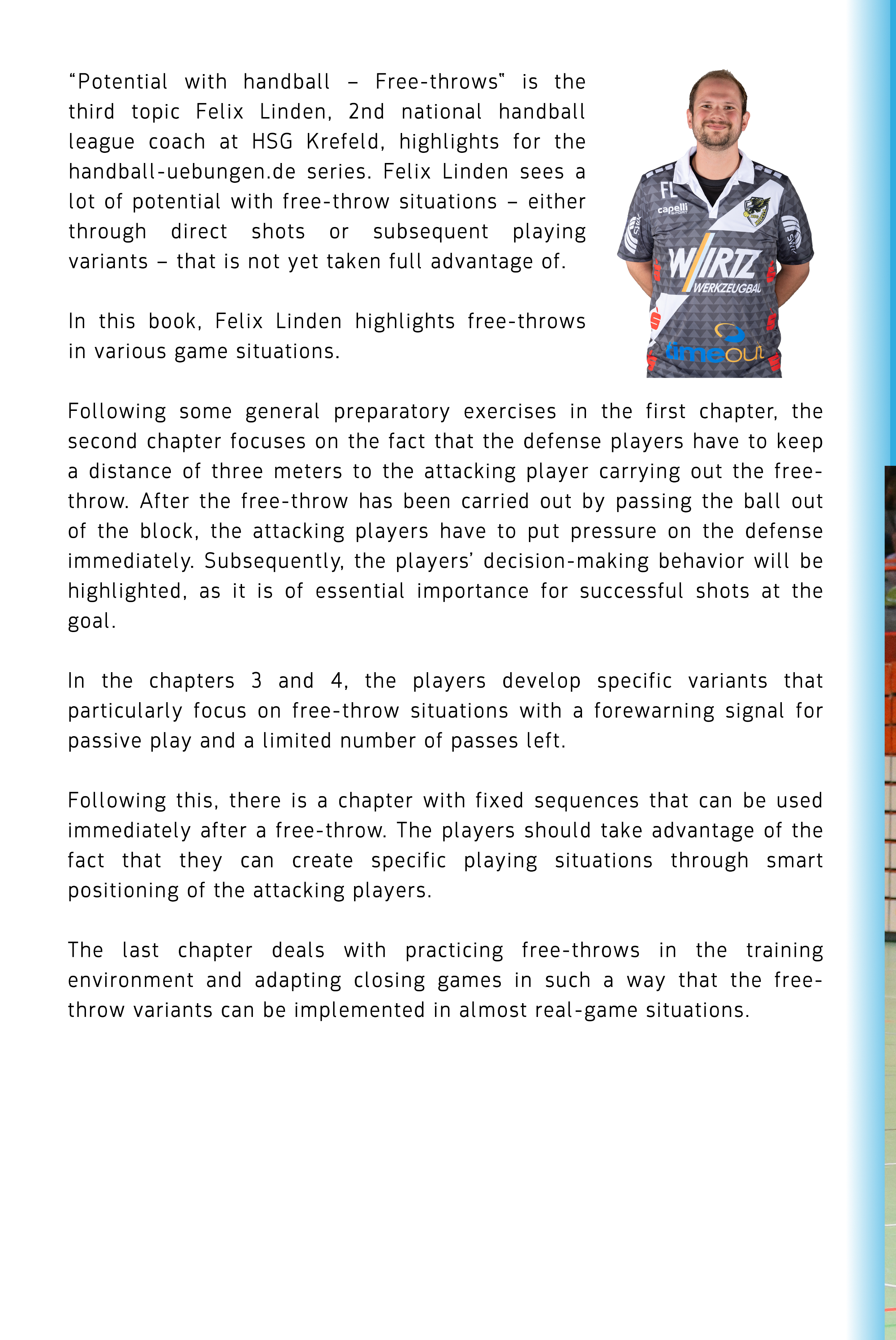 Following some general preparatory exercises in the first chapter, the second chapter focuses on the fact that the defense players have to keep a distance of three meters to the attacking player carrying out the free-throw. After the free-throw has been carried out by passing the ball out of the block, the attacking players have to put pressure on the defense immediately. Subsequently, the players’ decision-making behavior will be highlighted, as it is of essential importance for successful shots at the goal.