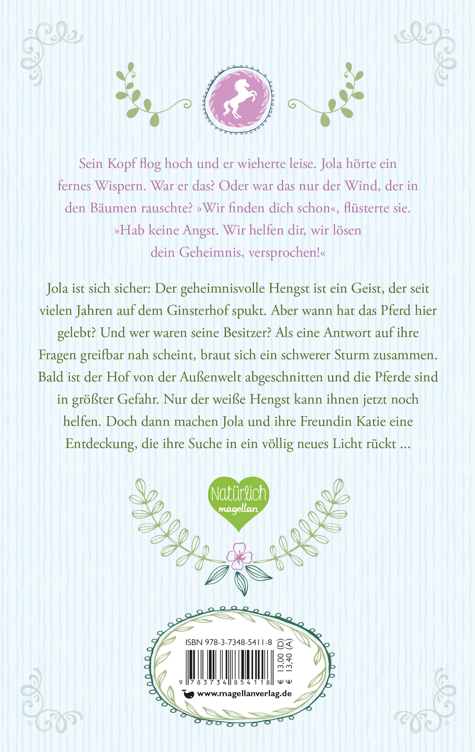 Jola ist sich sicher: Der geheimnisvolle Hengst ist ein Geist, der seit vielen Jahren auf dem Ginsterhof spukt. Aber wann hat das Pferd hier gelebt? Und wer waren seine Besitzer? Als eine Antwort auf ihre Fragen greifbar nah scheint, braut sich ein schwerer Sturm zusammen. Bald ist der Hof von der Außenwelt abgeschnitten und die Pferde in größter Gefahr. Nur der weiße Hengst kann ihnen jetzt noch helfen. Doch dann machen Jola und Katie eine Entdeckung, die ihre Suche in ein völlig neues Licht rückt ...