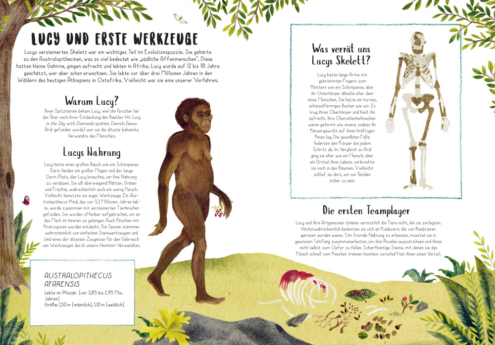 Dieses reich bebilderte Sachbuch führt Kinder durch die Schlüsselmomente der menschlichen Evolution und erklärt, wie wir uns über Jahrmillionen zu dem Homo sapiens entwickelt haben, der wir heute sind. Unsere Vorfahren und der aufrechte Gang werden dabei ebenso wissenschaftlich fundiert und kindgerecht beleuchtet wie die Bedeutung des Feuermachens, der Sesshaftigkeit, unserer Haustiere, des ersten Handels oder der Kunst.