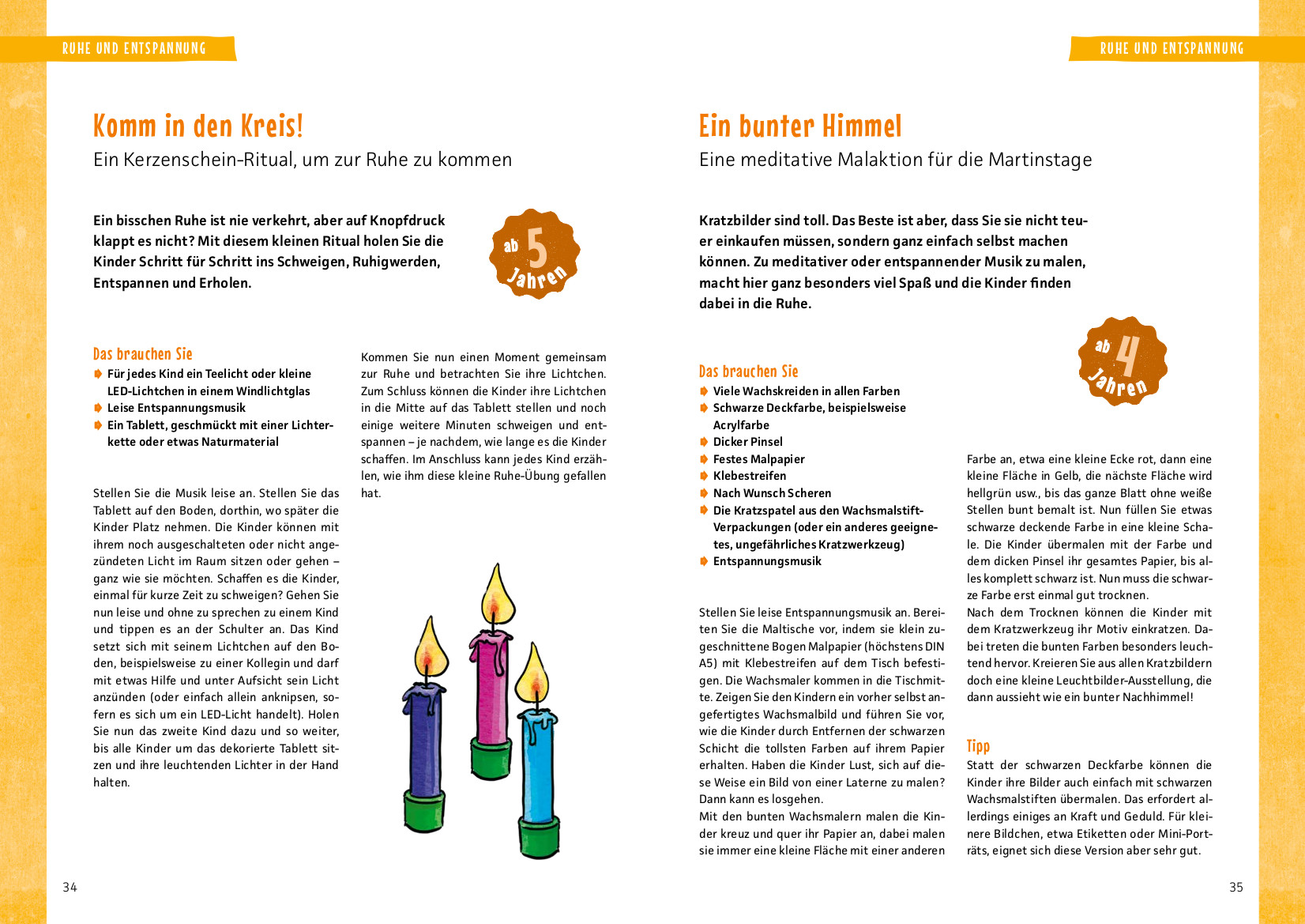 - Ruhe und Entspannung (Rezepte, Malen, Kerzenschein-Ritual, Meditation, Ideen zum Thema Wahrnehmung und Meditation uvm.)