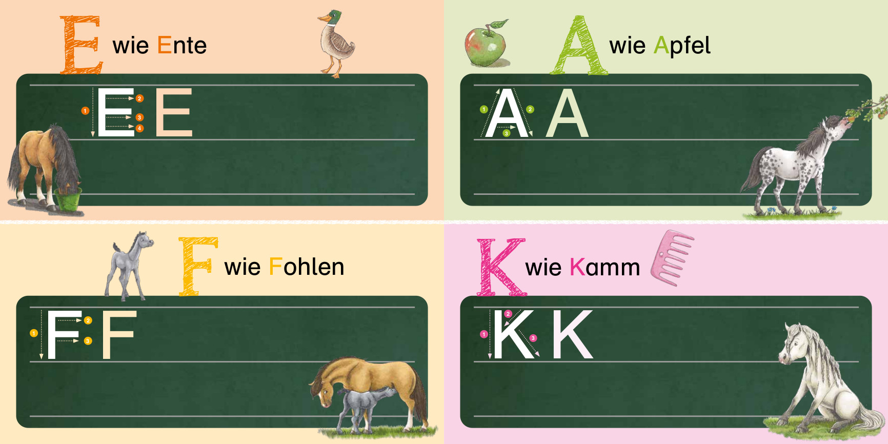- Auf den Seiten im Buch tummeln sich viele verschiedene Pferde, die das Lernen für Kinder gleich viel spaßiger machen.
