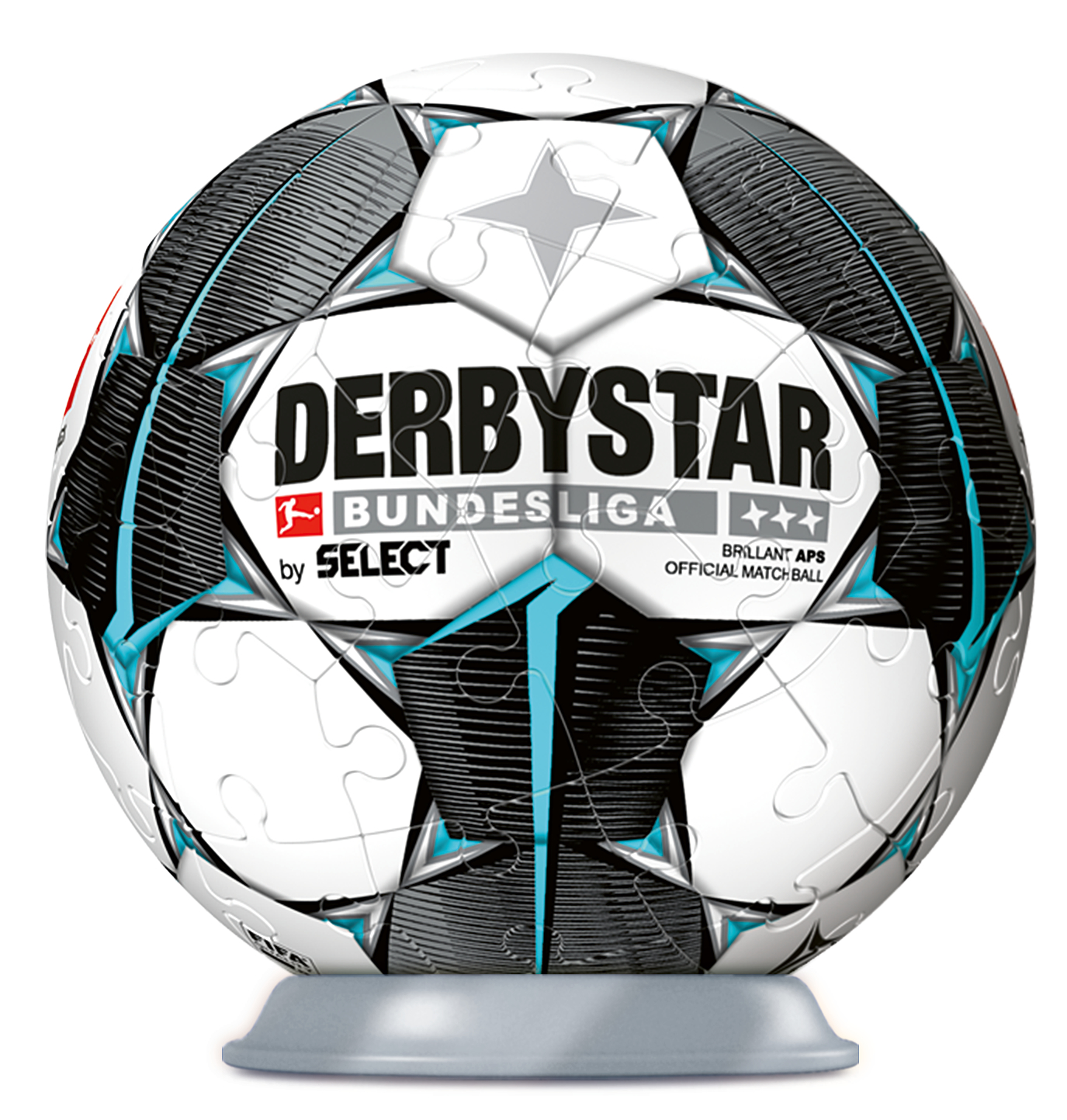 Was wäre das Leben...ohne Bundesliga! Alle Fußballfans dürfen sich nun doppelt auf die neue Saison freuen, denn den original Spielball gibt es jetzt auch als 3D Puzzle-Ball. Aus 54 gewölbten Kunststoff-Puzzleteilen, die dank Easyclick Technology perfekt zusammen passen, entsteht eine stabile Kugel, ganz ohne Kleben. Die Nummerierung der Teile auf der Rückseite erleichtert das Vorsortieren und ermöglicht einfaches Puzzeln nach Zahlen. Ideal zum Puzzeln, Dekorieren und Verschenken! Spiel-Inhalt: 54 nummerierte Kunststoff-Puzzleteile + Aufstellfuß + Anleitung. Spieleanleitung in deutsch, niederländisch, spanisch, französisch, italienisch, englisch. Anzahl Puzzleteile: 54.