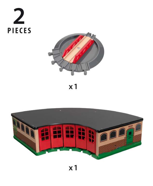 Wo werden die Züge abgestellt? Im großen Ringlokschuppen natürlich! Nimm die Drehscheibe, um die Züge gleich auf ihre individuellen Plätze zu stellen. Die hinteren Türen können geöffnet werden, was das Durchfahren von der Rückseite ebenso ermöglicht. Es passen fünf Fahrzeuge hinein und eine drehbare Weiche ist außerdem enthalten.