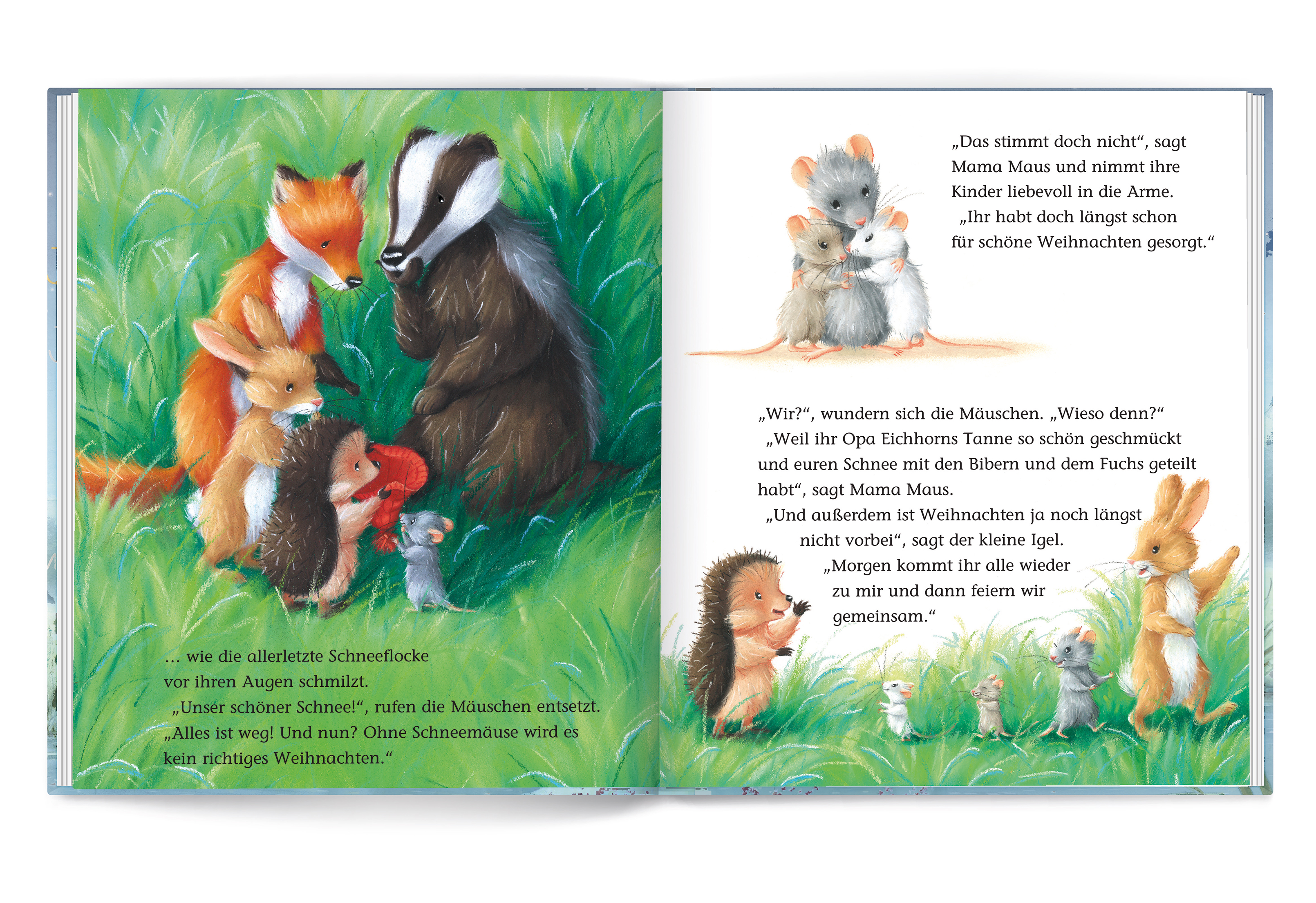 Der kleine Igel und seine Freunde erleben ein hinreißendes Weihnachtsabenteuer: Schneemäuse bauen das ist der größte Weihnachtswunsch der beiden Mäusekinder. Aber es ist kein Schnee da! Was nun? Der kleine Igel hat natürlich die rettende Idee: Gemeinsam mit seinen Freunden geht er auf eine spannende Schneejagd. Jedes Flöckchen, das sie finden, stopft der kleine Igel in seine rote Mütze, bis sie fast zerreißt. Doch auf dem Heimweg teilen die großzügigen Mäusekinder den mühsam zusammengetragenen Schnee mit immer wieder anderen Tieren, bis keiner mehr übrig ist. Ob ihr Weihnachtswunsch trotzdem in Erfüllung geht?Durchgängig mit Textil-Applikationen zum Fühlen und Staunen!