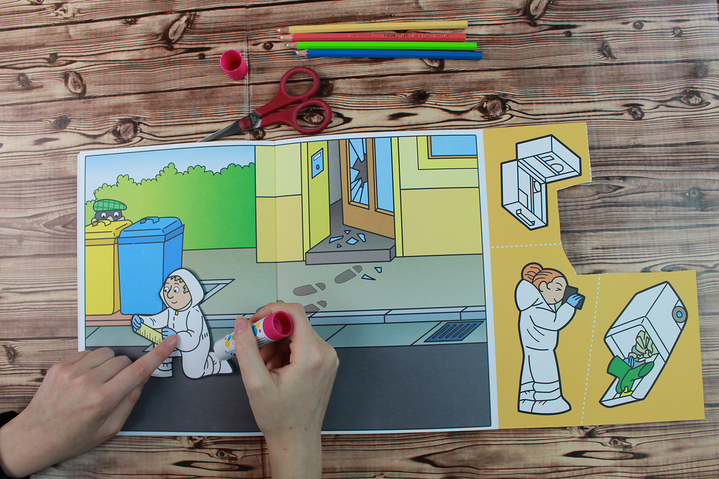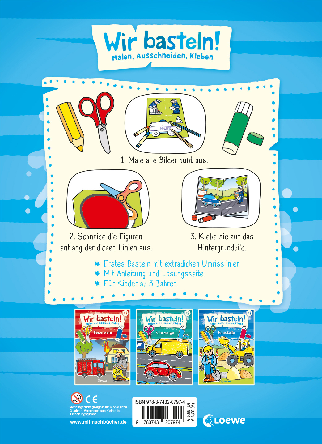 Basteln ist doch kinderleicht! Zuerst wird die perforierte Ausklappseite abgetrennt und dann werden die Motive ausgemalt. Danach dürfen kleine Bastler die Motive entlang der extradicken Umrisslinien ausschneiden und in die Polizeiszene einkleben. Die fertigen Bilder auf der Lösungsseite können hierbei eine Hilfe sein.