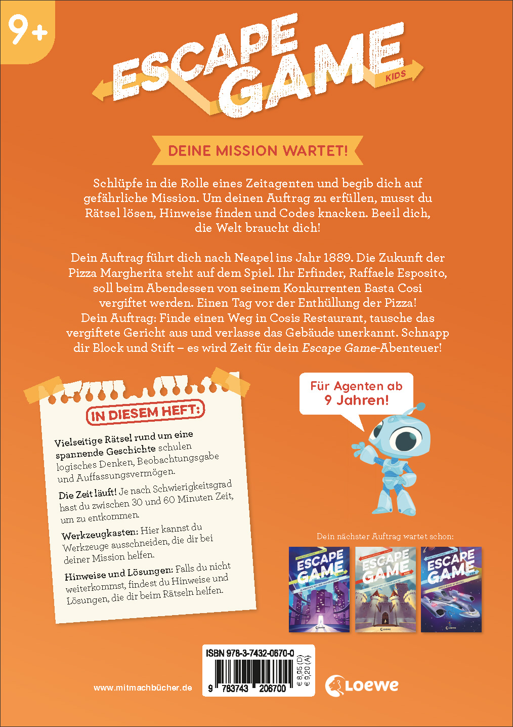 | Schlagworte | Beschäftigungsbuch Italien Rom Pizza • Beschäftigungsbuch Mitmachbuch • Bücher wie Escape Game • Bücher wie EXIT - Das Buch • Bücher wie Mission: Exit • Bücher wie X-Scape • Escape Room Buch • Escape Spiel Buch • Geschenk für Kind ab 9 neun Jahre Jahren • Kinderbuch Italien Rom Pizza |