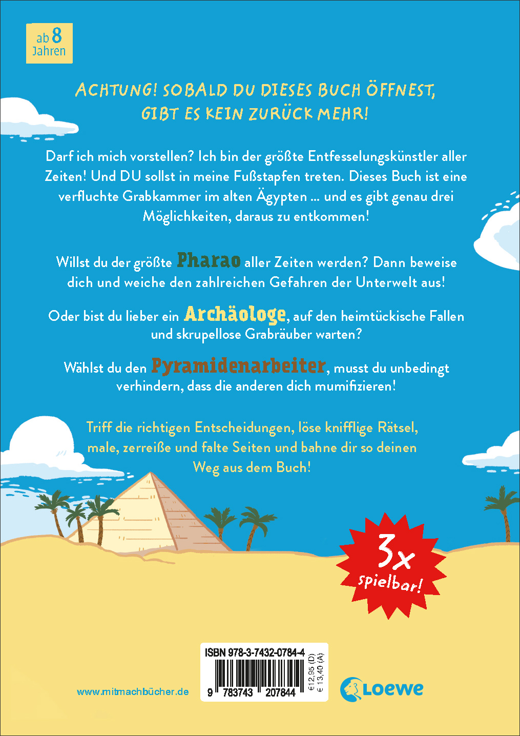 Triff die richtigen Entscheidungen, löse knifflige Rätsel, erfahre mehr über geheimnisvolle Pyramiden und finde so deinen Weg aus dem Buch, ähm, aus der Grabkammer! Dabei musst du ins Buch malen, Seiten zerschneiden, falten und sogar zerreißen – deine Rettung hängt davon ab!
