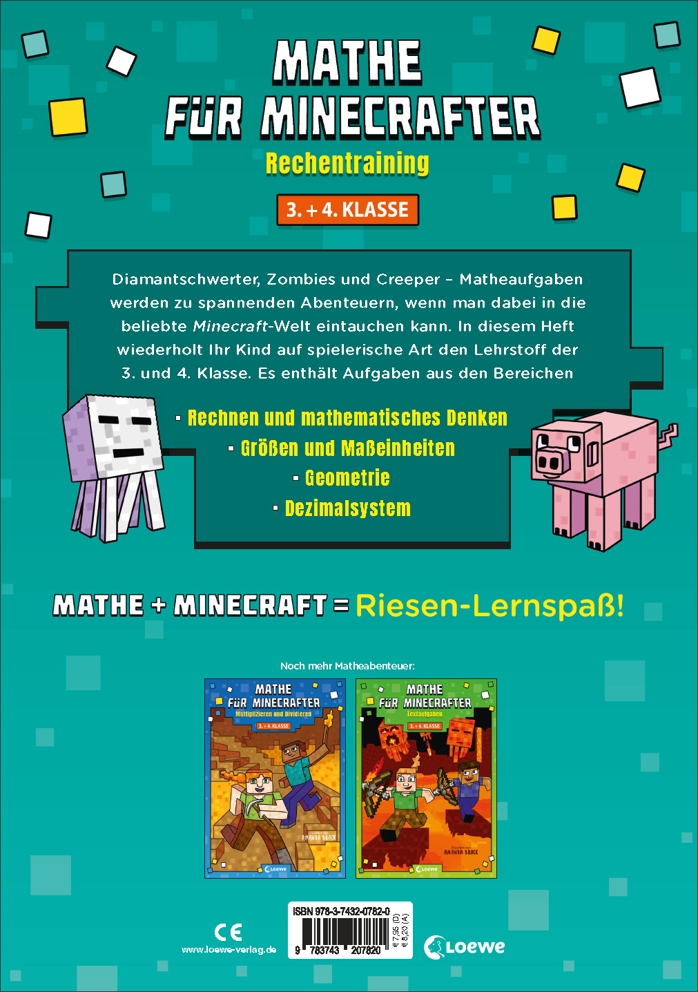 Mit diesen Übungsheften zum Schulfach Mathe wird jeder Minecraft-Fan zum echten Abenteurer. Spannende Aufgaben trainieren die Rechenfähigkeiten und helfen Schülern in der 3. und 4. Klasse, jede Mathe-Klausur zu bestehen. Durch die bekannten Minecraft-Charaktere und -Items, die durch die Aufgaben begleiten, bekommen Kinder ab 8 und 9 Jahren einen ganz eigenen Zugang zum Schulfach und festigen so nebenbei ihr Wissen. So wird jeder Gamer zum Mathe-Ass!