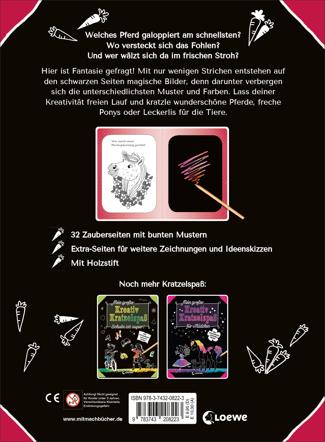 Welches Pferd galoppiert am schnellsten? Wo versteckt sich das Fohlen? Und wer wälzt sich da im frischen Stroh? Hier ist Fantasie gefragt! Mit nur wenigen Strichen entstehen auf den schwarzen Seiten magische Bilder, denn darunter verbergen sich die unterschiedlichsten Muster und Farben. Lass deiner Kreativität freien Lauf und kratzle wunderschöne Pferde, freche Ponys oder Leckerlis für die Tiere.