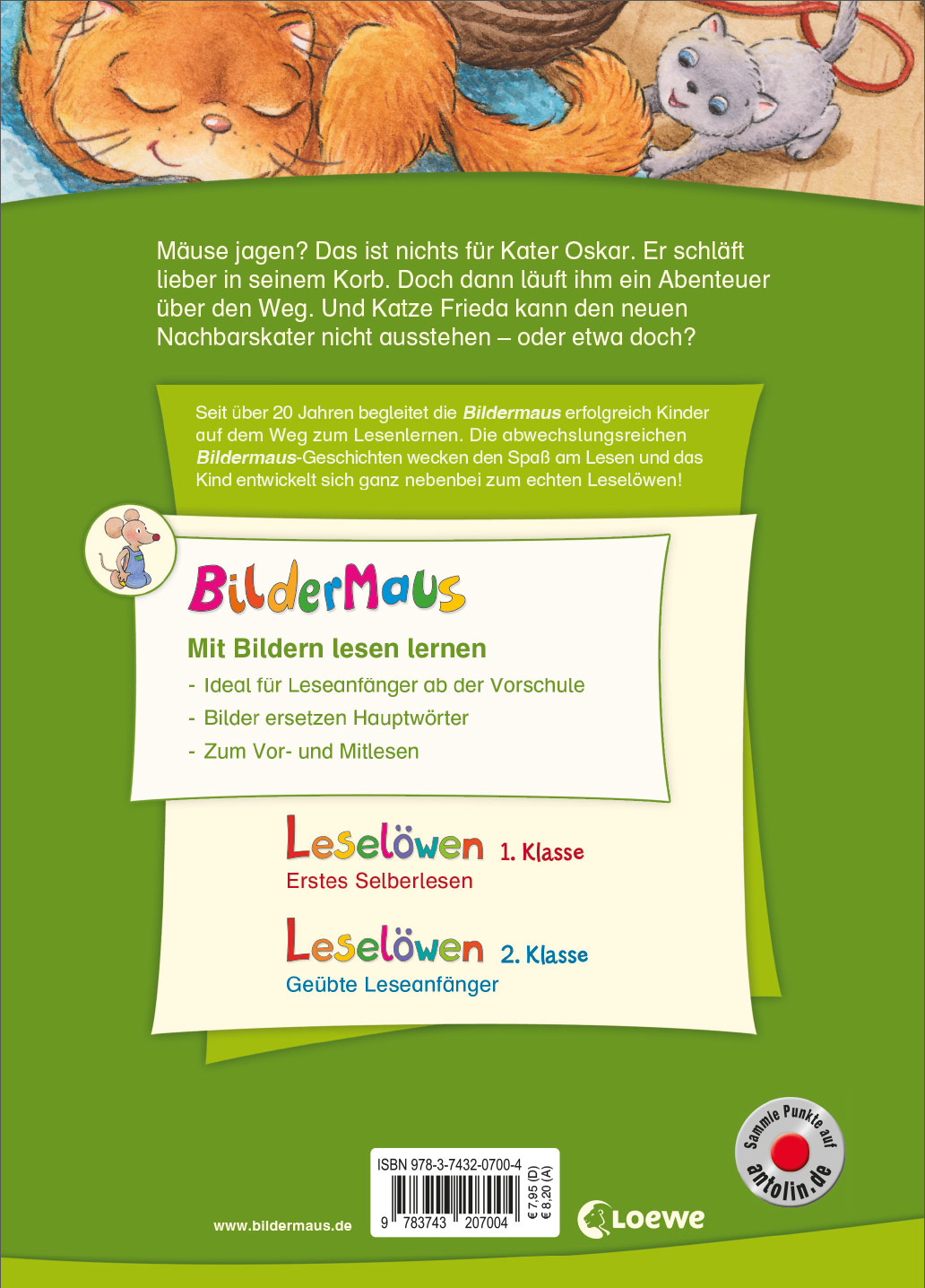 Oskar schläft lieber, statt Mäuse zu jagen, daher lachen ihn die anderen Katzen aus. Aber dann kann Oskar die Straßenkatzen doch beeindrucken. Und Katze Frieda kann den neuen Nachbarskater nicht ausstehen – oder etwa doch?
