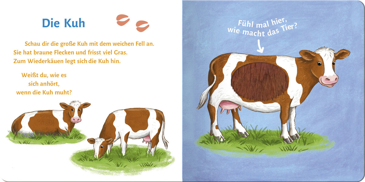 Fühl mal hier, wie macht das Tier?Streichle über das weiche Fell und du kannst hören, wie die Kuh muht, das Schwein grunzt und der Hahn kräht. Entdecke in diesem Buch, was die Bauernhoftiere gerne machen.