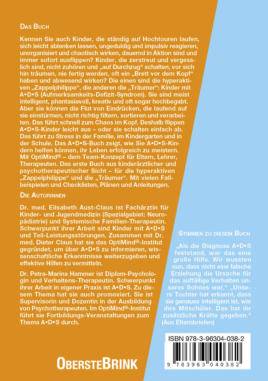 Das A.D.S-Buch zeigt, wie Sie A.D.S-Kindern helfen können, ihr Leben erfolgreich zu meistern. Mit OptiMind® – dem Team-Konzept für Eltern, Lehrer, Therapeuten. Das erste Buch aus kinderärztlicher und psychotherapeutischer Sicht – für die hyperaktiven „Zappelphilippe“ und die „Träumer“. Mit vielen Fallbeispielen und Checklisten, Plänen und Anleitungen.