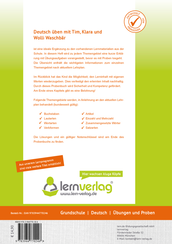 Das Probenbuch 2. Klasse Deutsch üben mit Tim, Klara und Wolli Waschbär aus dem Hause lernverlag, ist der passende Wegbegleiter schon während des Schuljahres. Das Probenbuch ist eine gute Vorbereitung auf die kommenden Leistungsnachweise und dient als Ergänzung für alle Grundschulkinder, die gerne zusätzlich Deutsch üben. Zu jedem Themengebiet werden nach dem aktuellen Lehrplan Übungsaufgaben und Proben abegefragt. Ein kurzer kindgerechter Rückblick schließt das einzelne Thema ab. In diesem Heft sind Original-Proben aus den Grundschulen abgedruckt, die aus dem Nachhilfebereich stammen. Die Lösungen finden sich am Ende des Buches und sind kindgerecht geschrieben.