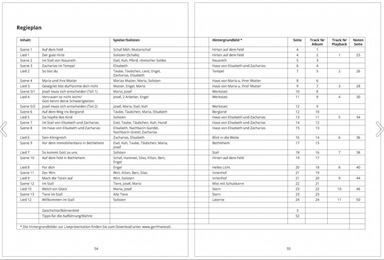 In Josefs Stall ist ganz schön was los: Luigi, ein Pferd aus Rom erzählt etwas von einer Volkszählung und Josef will nach einer kleinen Krise ein Schloss bauen. Ella, die Kuh, und Hieronymus, der Esel, begleiten Maria auf eine Reise ins Bergland. Dort besuchen sie die schwangere Elisabeth. Bei ihrer Begegnung hüpft vor Freude das Kind in ihrem Bauch.Zusammen mit zwei Tauben, die mit Zacharias im Tempel einen Engel gesehen haben, begleiten die Tiere Josef und Maria auf ihrem Weg nach Bethlehem. Er führt vorbei an unzufriedenen Neidhammeln und schwarzen Schafen. In Bethlehem wird Jesus in einem Stall geboren und alle singen gemeinsam: Willkommen im Stall!Thema: WeihnachtenAlter: ab 6-14 JahreSchwierigkeitsgrad: mittelAufführungsdauer: ca. 50 Minuten Besetzung: Tiere: Schaf Mäh, Mutterschaf, Schaf, Hammel, Esel Hieronymus, Pferd Luigi, Kuh Ella, Hund Hasso, Taube, TäubchenMenschen: Elisabeth, Zacharias, Levit, Maria, Mutter von Maria, Josef, Soldat, 2 Holzarbeiter, Nachbarinnen: Gundel und Gretel, Hirten: Kilian, Silas, Bert, WirtEngel: Zacharias Engel, Marias Engel, Josefs Engel, mindestens 3 Hirtenengel Chor, Sprecher: optionalInszenierung:Die Szenen werden durch verschiedene Bühnen- und Hintergrundbilder dargestellt. Ausführliche Beschreibungen dazu sowie Anleitungen finden Sie im Arbeitsheft. Inhalt: Lied- und Spechertexte, einstimmige Noten und RegieanweisungenLieder:Der gute HirteSo bist duGesegnet bist du/Fürchte dich nichtVertrauen ist nicht leicht/Gott kennt deine SchwierigkeitenDa hüpfte das KindSein KönigreichSo kommt Gott zu unsFür dichMach die Türen aufWelch ein GlückWillkommen im Stall