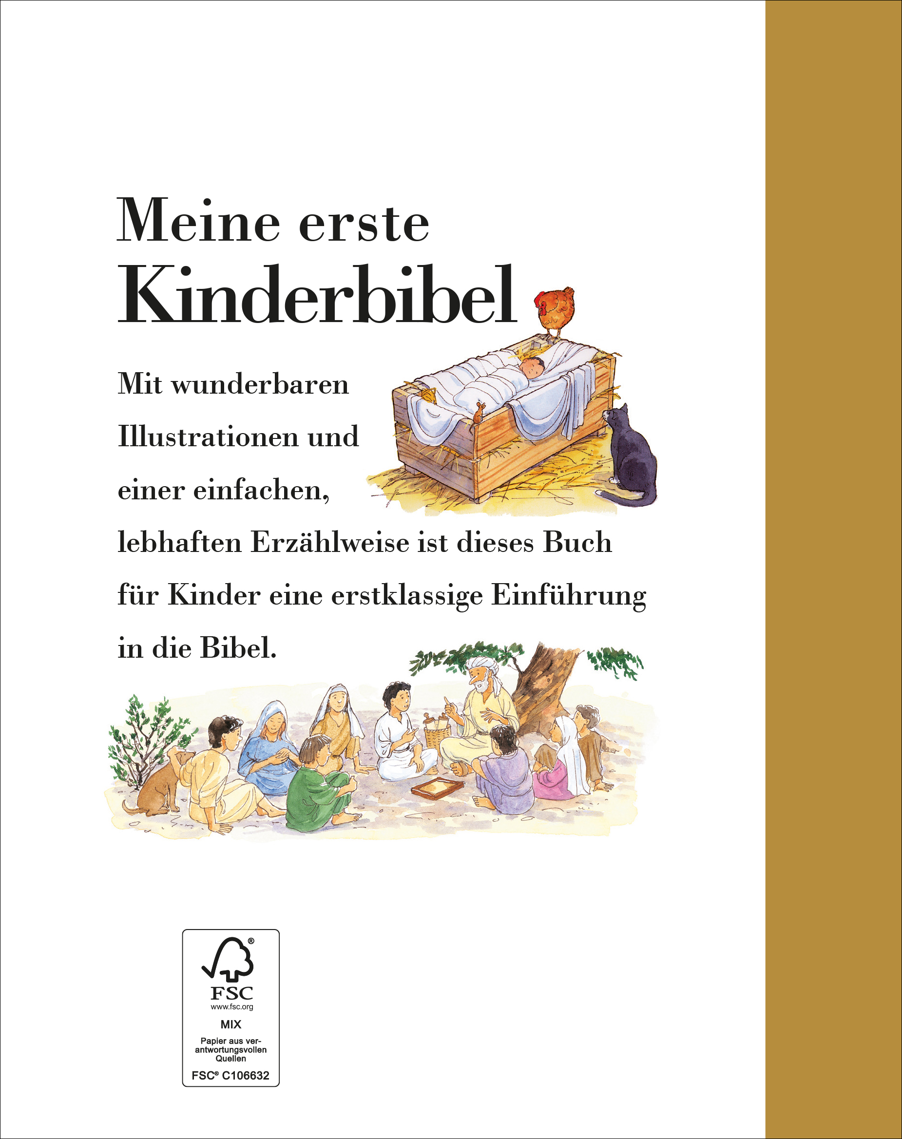 Die Geschichten aus dem Alten und Neuen Testament werden in diesem Buch in einfacher, lebendiger Sprache nacherzählt: Das Wunder der Erschaffung der Erde, die Arche Noah in der großen Flut, der Turmbau zu Babel, Josefs Abenteuer beim Pharao, Gottes zehn Gebote, der kleine David im Kampf gegen Goliath, Daniel in der Löwengrube, Jona und der Walfisch, Maria und Josef im Stall von Bethlehem, Jesus und seine zwölf Jünger, der gute Samariter, die Kreuzigung und Auferstehung. Mit den zahlreichen, wunderschönen Illustrationen ist dieses Buch eine erstklassige Einführung in die Bibel für Kinder. Auch für ältere Kinder, die schon selber lesen können, ist sie sehr gut geeignet. Die edle Gestaltung macht die Bibel zu einem idealen Geschenk zu Taufe, Kommunion, Konfirmation oder zu Weihnachten