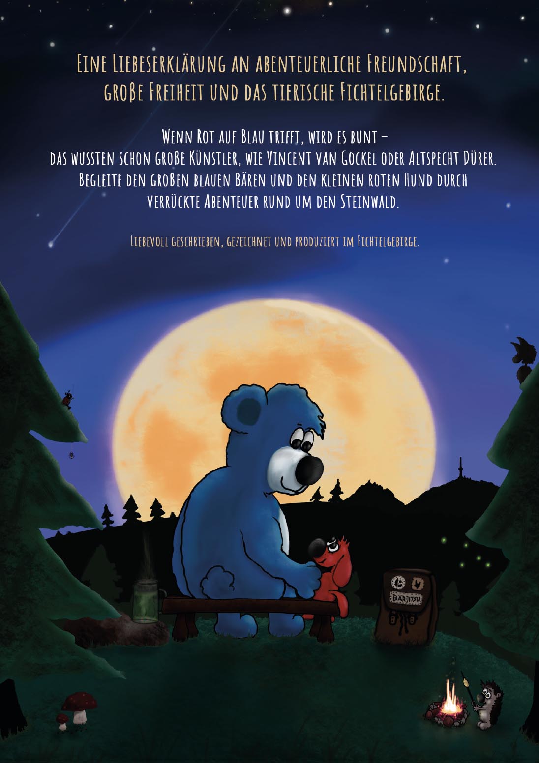 "Eine Liebeserklärung an abenteuerliche Freundschaft, große Freiheit und das tierische Fichtelgebirge." Wenn Rot auf Blau trifft, wird es bunt - das wussten schon große Künstler, wie Vincent van Gockel oder Altspecht Dürer. Begleite den großen blauen Bären und den kleinen roten Hund durch verrückte Abenteuer rund um den Steinwald. Eine herzerwärmende und etwas verrückte Abenteuergeschichte über 40 mit strahlenden Farben bebilderte Seiten.