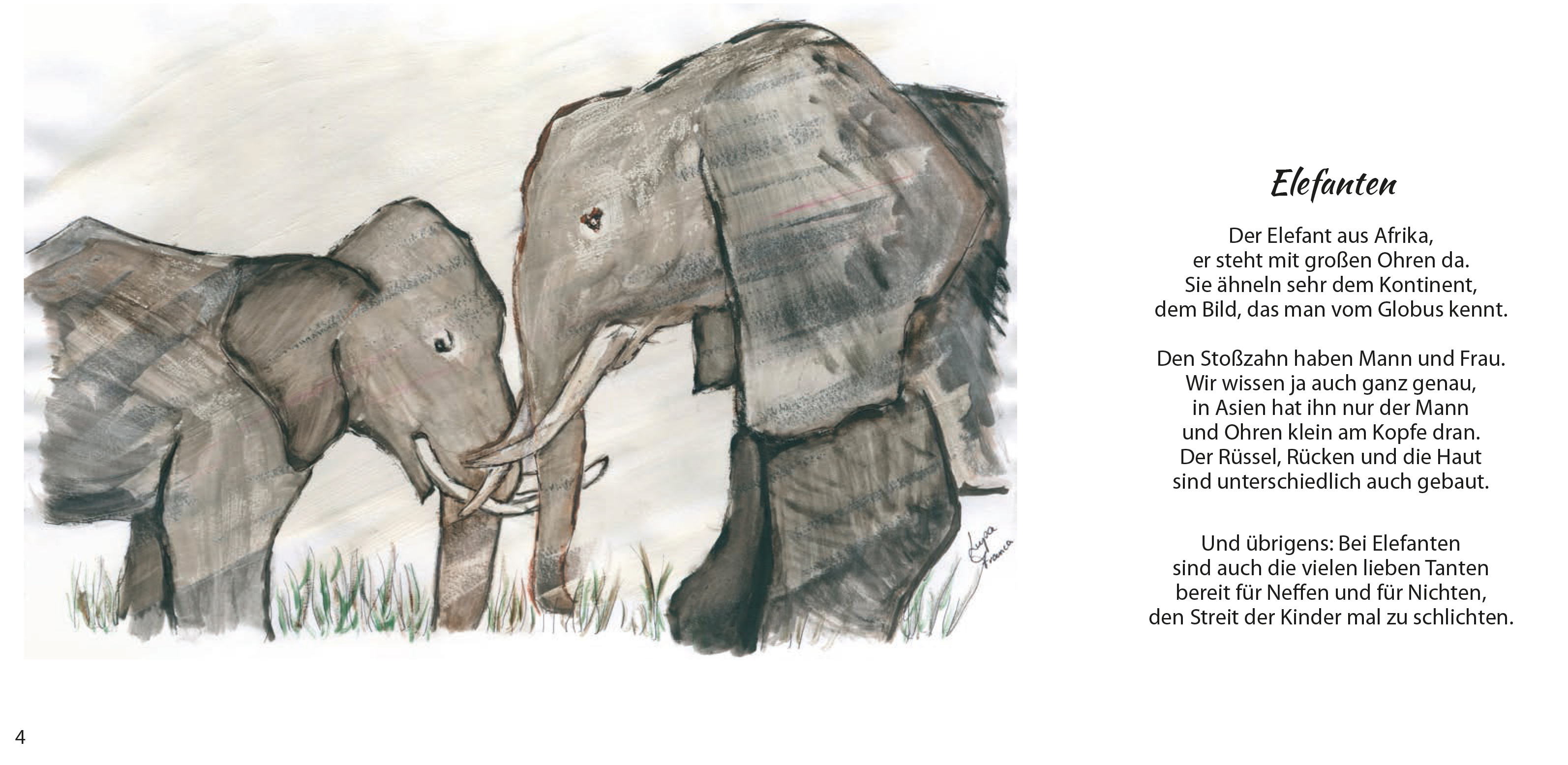 In diesem Buch will ich euch neben Tieren unserer Heimat auch Tiere zeigen, die ihr nicht immer sehen könnt. Ihr müsst sie im Zoo suchen, weil sie in fernen Ländern leben und manchmal dort auch sehr versteckt. Ihr könnt ein bisschen über ihr Aussehen, ihr Leben und Verhalten erfahren. Das Buch soll euch anregen, in einen Tierpark oder Zoo zu gehen, um mehr über diese Tiere zu lernen. Beim Lesen der Verse und beim Beobachten der Tiere wünsche ich euch viel Spaß.