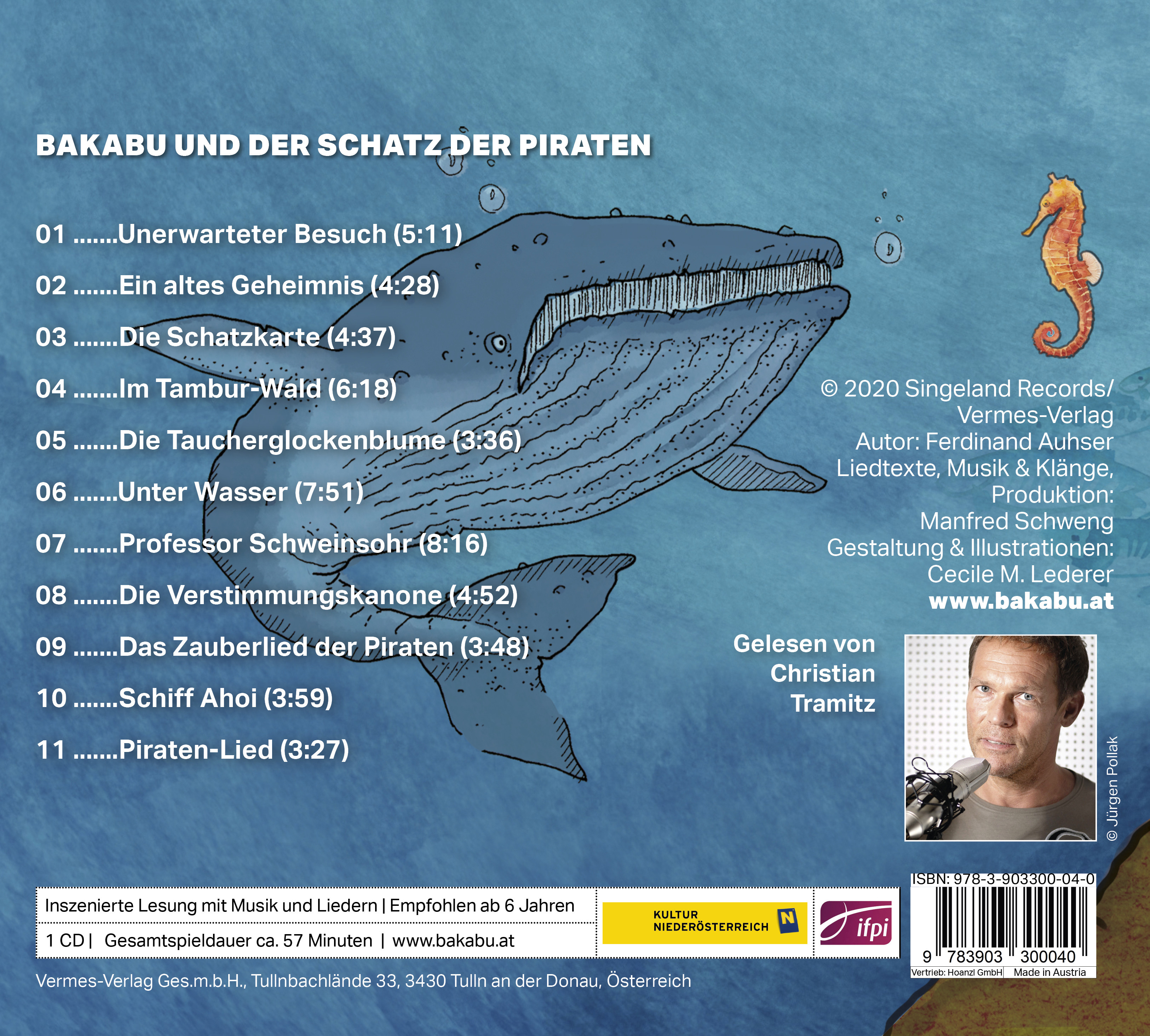 Das neue Abenteuer von Bakabu, dem Ohrwurm - für Kinder ab 6 Jahren. Gelesen von Christian Tramitz, mit Musik & Klängen von Manfred Schweng.Durch eine alte Karte erfährt Bakabu von einer Schatztruhe am Grund des Stillen Ozeans. Angeblich liegt darin das geheimnisvolle Zauberlied der Piraten. Natürlich müssen der neugierige Ohrwurm und seine Freunde diesen Schatz finden, doch damit beginnt ein aufregendes Abenteuer. Bald stehen Bakabu, Charlie Gru und Mimi Lou einer Truppe wilder, rattiger Ratschen-Piraten gegenüber und machen Bekanntschaft mit dem furchtbar fürchterlichen Professor Schweinsohr, der Tag und Nacht nur eines im Sinn hat: alle Musik im Singeland zu zerstören ...