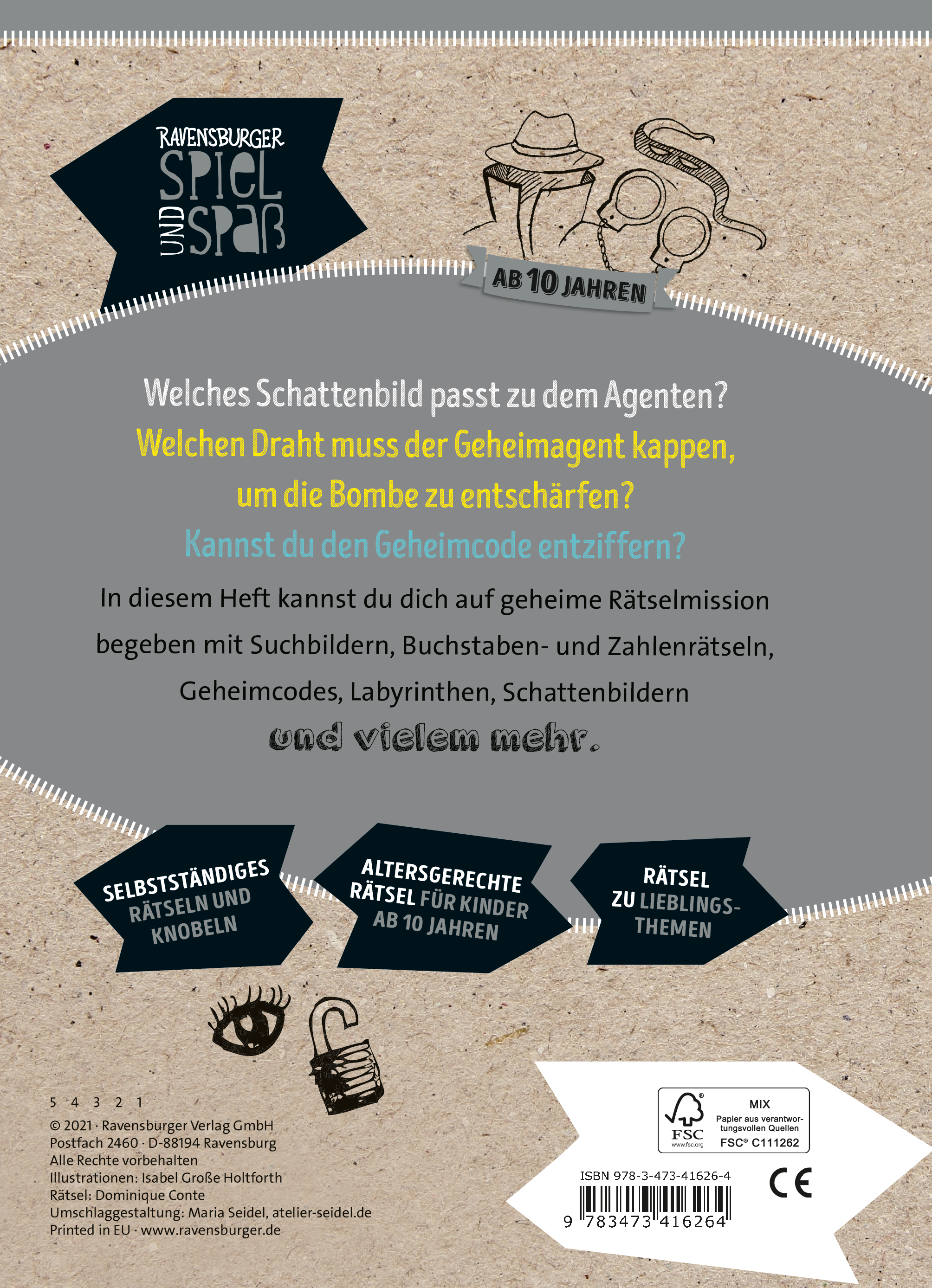 In diesem Heft können sich die Kinder auf geheime Rätselmission begeben mit Suchbildern, Buchstaben- und Zahlenrätseln, Geheimcodes, Labyrinthen, Schattenbildern und vielem mehr.