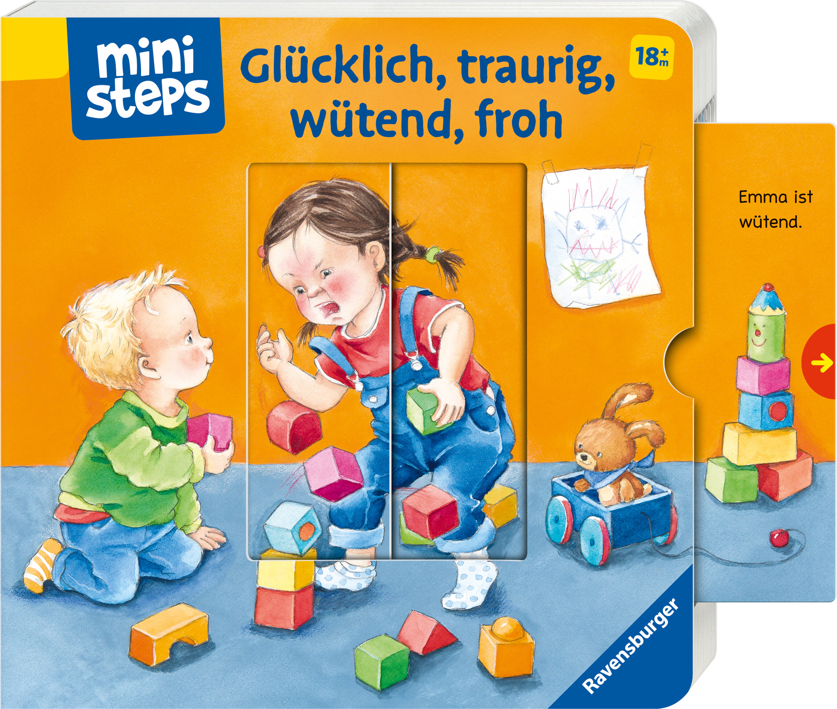 Bei Kindern können sich Gefühle blitzschnell ändern. Gerade noch haben Finn und Hannah fröhlich zusammen gemalt, doch als Finns Bild zerreißt, ist er richtig wütend! Zum Glück kann Hannah das Bild reparieren. Da ist Finn wieder glücklich.Im Schwimmbad sitzt Pelle ein bisschen ängstlich am Beckenrand. Aber zusammen mit Papa traut er sich doch noch ins Wasser. Ganz schön mutig von Pelle!Diese und viele weitere kleine Szenen aus der Erfahrungswelt der Kleinen, laden Kinder dazu ein, mit den Schiebern die Bilder und damit auch die Gefühle zu verändern. Warum ist das Kind im Buch traurig? Warum ist ein anderes Kind fröhlich?Beim gemeinsamen Betrachten der Bilder, dem Lesen der Texte und dem Verändern der Bilder durch die Schieber lernen Kinder spielerisch die verschiedenen Emotionen kennen und können darüber sprechen. Das ist wichtig für die kleinkindliche Entwicklung und die Bindung zwischen Eltern und Kindern.Dieses Spielbuch ist genau auf die Entwicklung von Kleinkindern abgestimmt. Es wurde von Pädagogen entwickelt und fördert Kinder altersgerecht und mit viel Spaß!