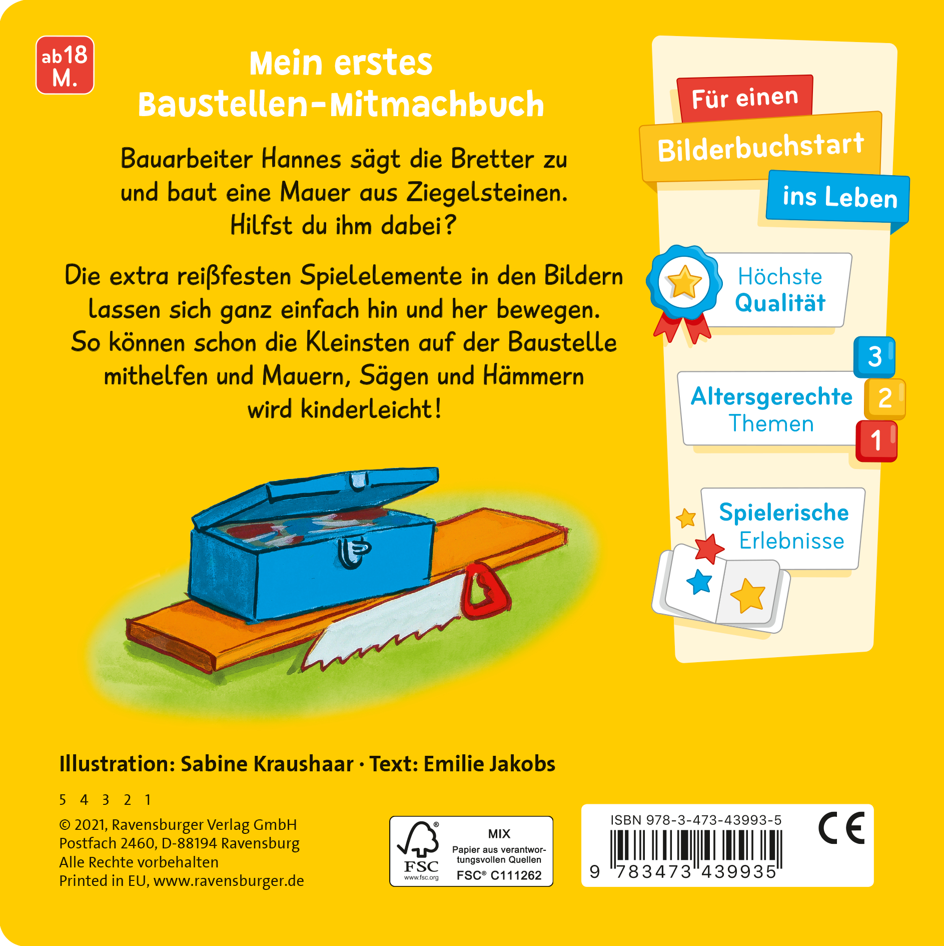 Auf der Baustelle gibt es immer was zu tun. Bauarbeiter Hannes misst die Bretter aus, baut eine Mauer und streicht die Wände an. Zum Glück bekommt er nun Unterstützung.Die großen Klappen regen zum Mitmachen an und lassen sich kinderleicht greifen und bewegen. So können bereits Kinder ab 18 Monaten auf der Baustelle mithelfen. Das Material der Klappen ist besonders reißfest. Trotz Rütteln, Schütteln und Ziehen geht so schnell nichts kaputt. Das garantiert extra langen Spielspaß.Ganz nebenbei fördern die Klappen dabei die motorische Entwicklung, unterstützen das räumliche Vorstellungsvermögen und machen neugierig auf viele weitere Entdeckungen.
