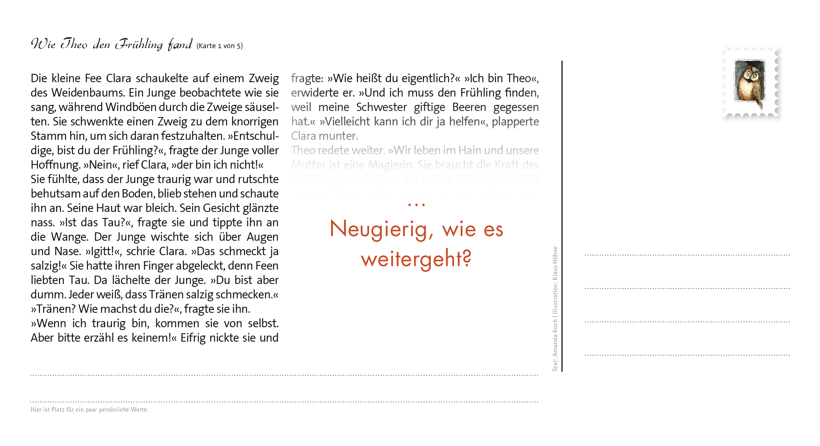 | Schlagworte | Familie • Gesundheit • Kurzgeschichte • Natur • Postkarte • Suche |
