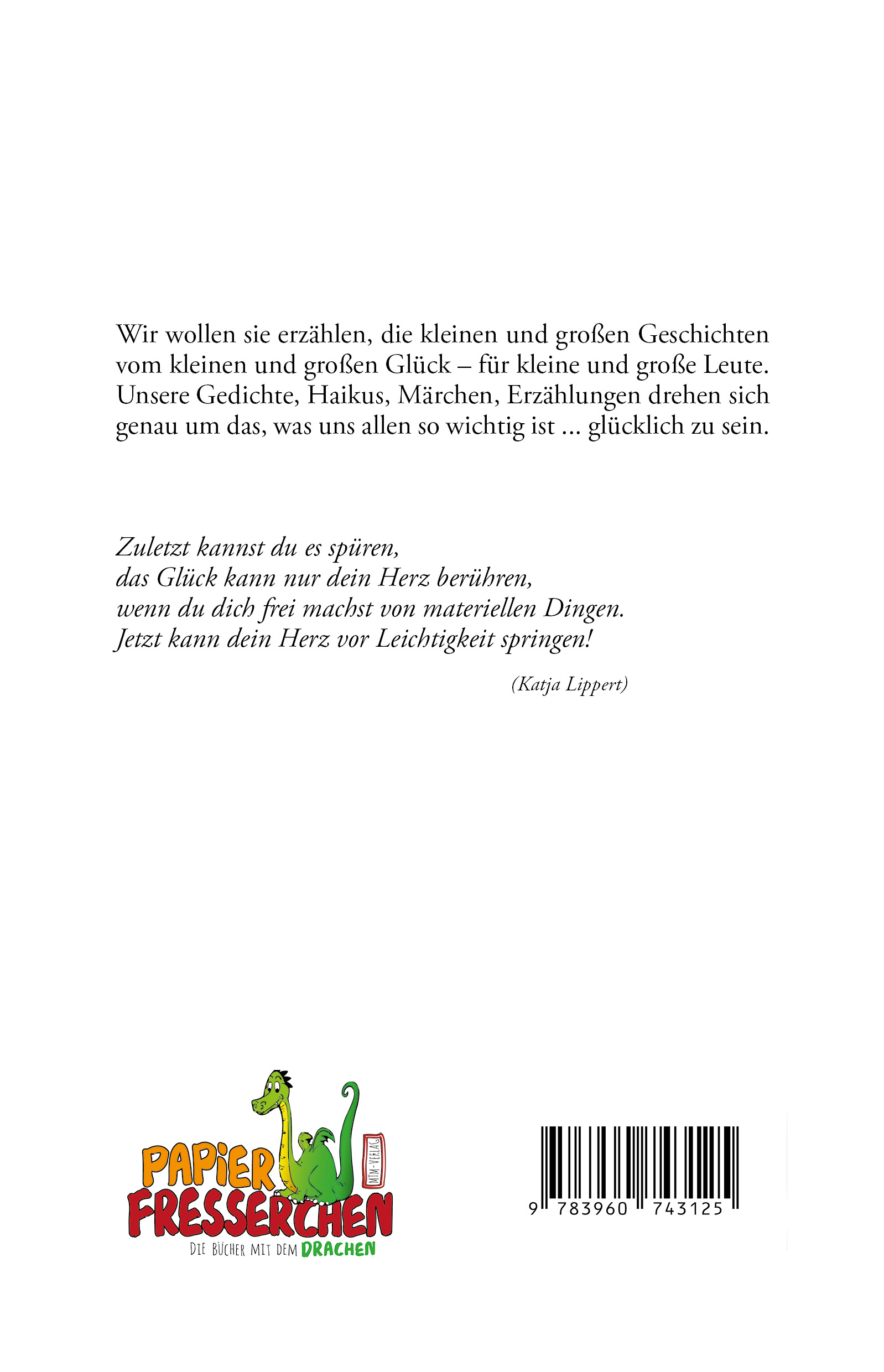 Wir wollen sie erzählen, die kleinen und großen Geschichten vom kleinen und großen Glück - für kleine und große Leute. Unsere Gedichte, Haikus, Märchen, Erzählungen drehen sich genau um das, was uns allen so wichtig ist ... glücklich zu sein.Zuletzt kannst du es spüren,das Glück kann nur dein Herz berühren,wenn du dich frei machst von materiellen Dingen.Jetzt kann dein Herz vor Leichtigkeit springen!(Katja Lippert)