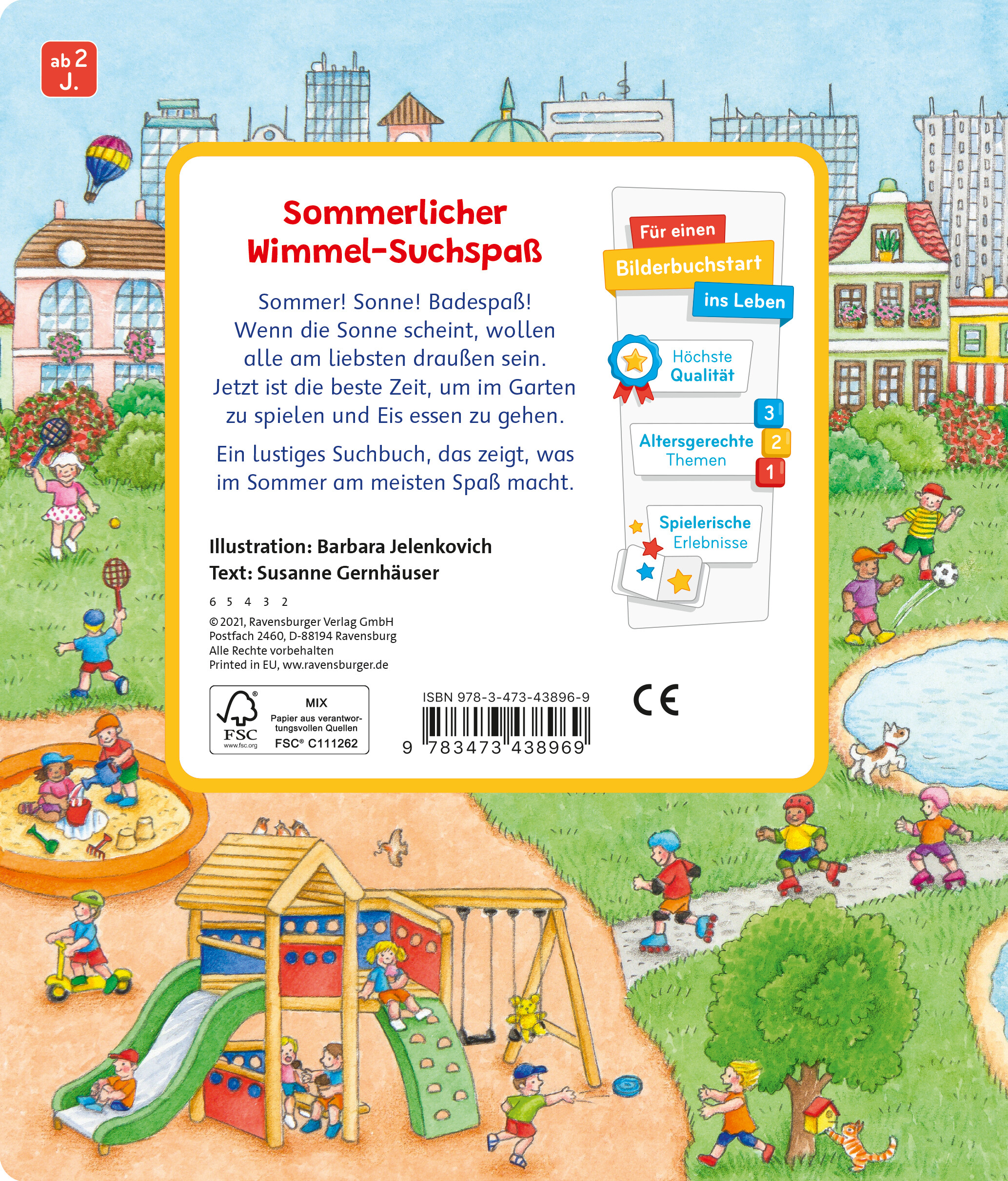 Sommer! Sonne! Badezeit! Wenn die Sonne scheint, möchten alle am liebsten draußen unterwegs sein. Im Kindergarten wird das große Sommerfest gefeiert und auf dem Marktplatz parkt ein neuer Eisstand. Im sonnigen Stadtpark genießen die Familien ihre Freizeit. Auf elf detailfreudigen Wimmelseiten zeigt dieses Such- und Findebuch alles, was zur Sommerzeit am meisten Spaß macht.