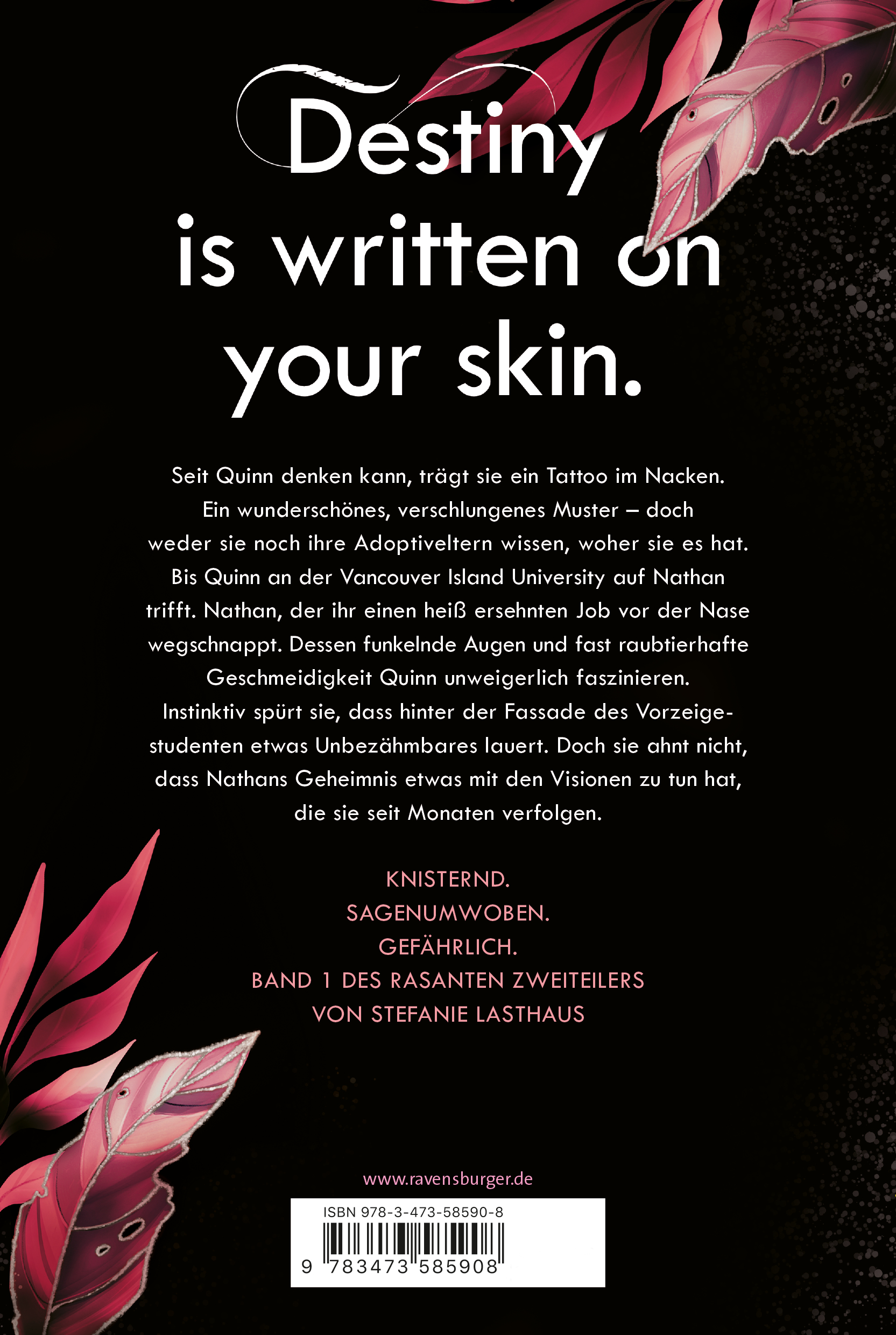Seit Quinn denken kann, trägt sie ein Tattoo im Nacken. Ein wunderschönes, verschlungenes Muster – doch weder Quinn noch ihre Adoptiveltern wissen, woher sie es hat. Bis Quinn im ersten Semester an der Vancouver Island University auf Nathan trifft. Nathan, der ihr einen heiß ersehnten Job vor der Nase wegschnappt. Dessen funkelnde Augen und fast raubtierhafte Geschmeidigkeit Quinn unweigerlich faszinieren. Instinktiv spürt sie, dass hinter der Fassade des Vorzeigestudenten etwas Unbezähmbares lauert. Doch sie ahnt nicht, dass Nathans Geheimnis etwas mit den unheimlichen Visionen zu tun hat, die sie seit Monaten verfolgen.