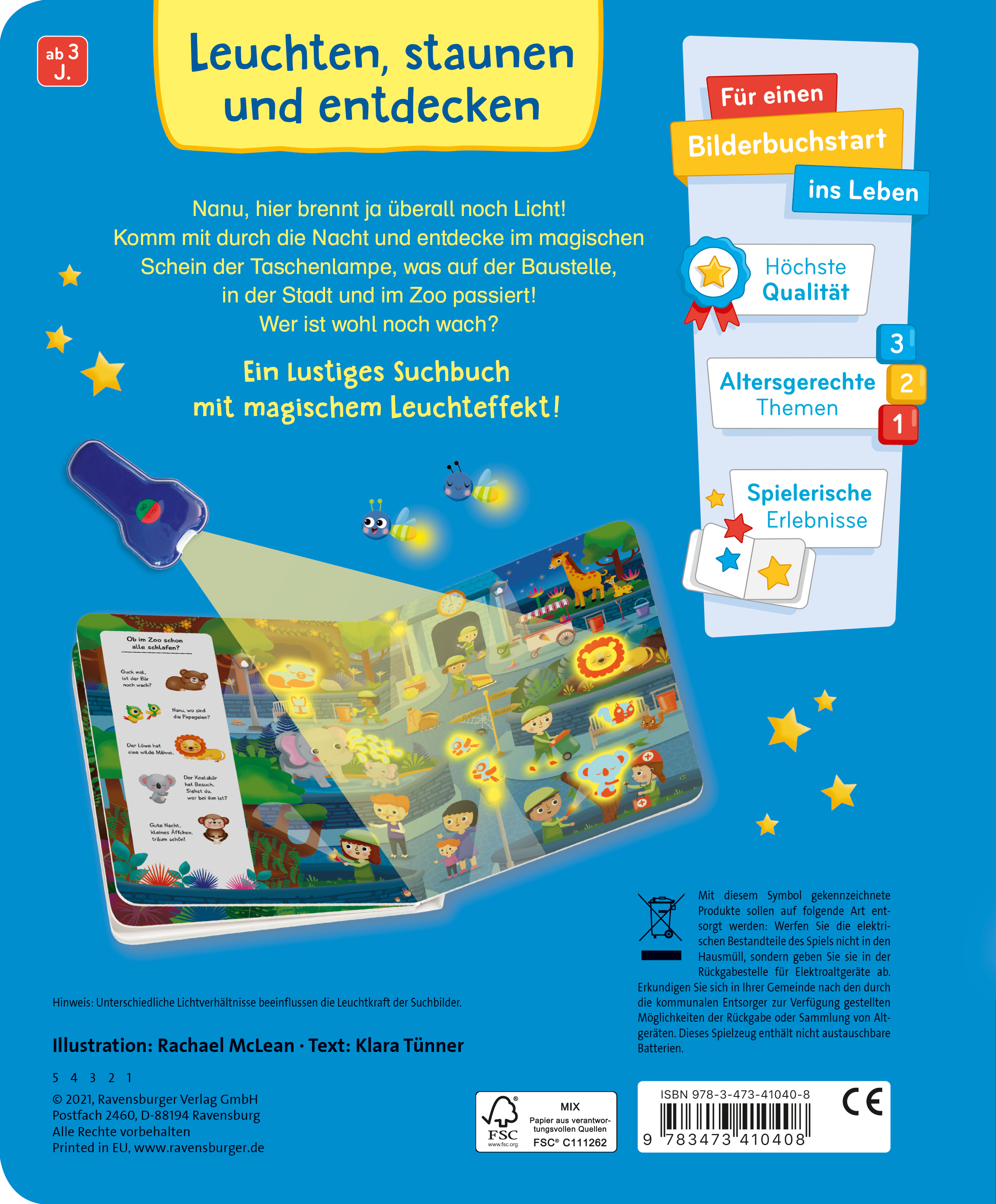 Bei Nacht gibt es viel zu entdecken: Wo schlafen die Tiere und wer wird erst wach, wenn der Mond aufgeht? Wie durch Zauberei erscheinen im Licht der Taschenlampe viele spannende Tiere und Gegenstände. Kleine Such-Bilder und kurze, animierende Texte fordern zum genauen Hinsehen, Entdecken und Staunen auf.
