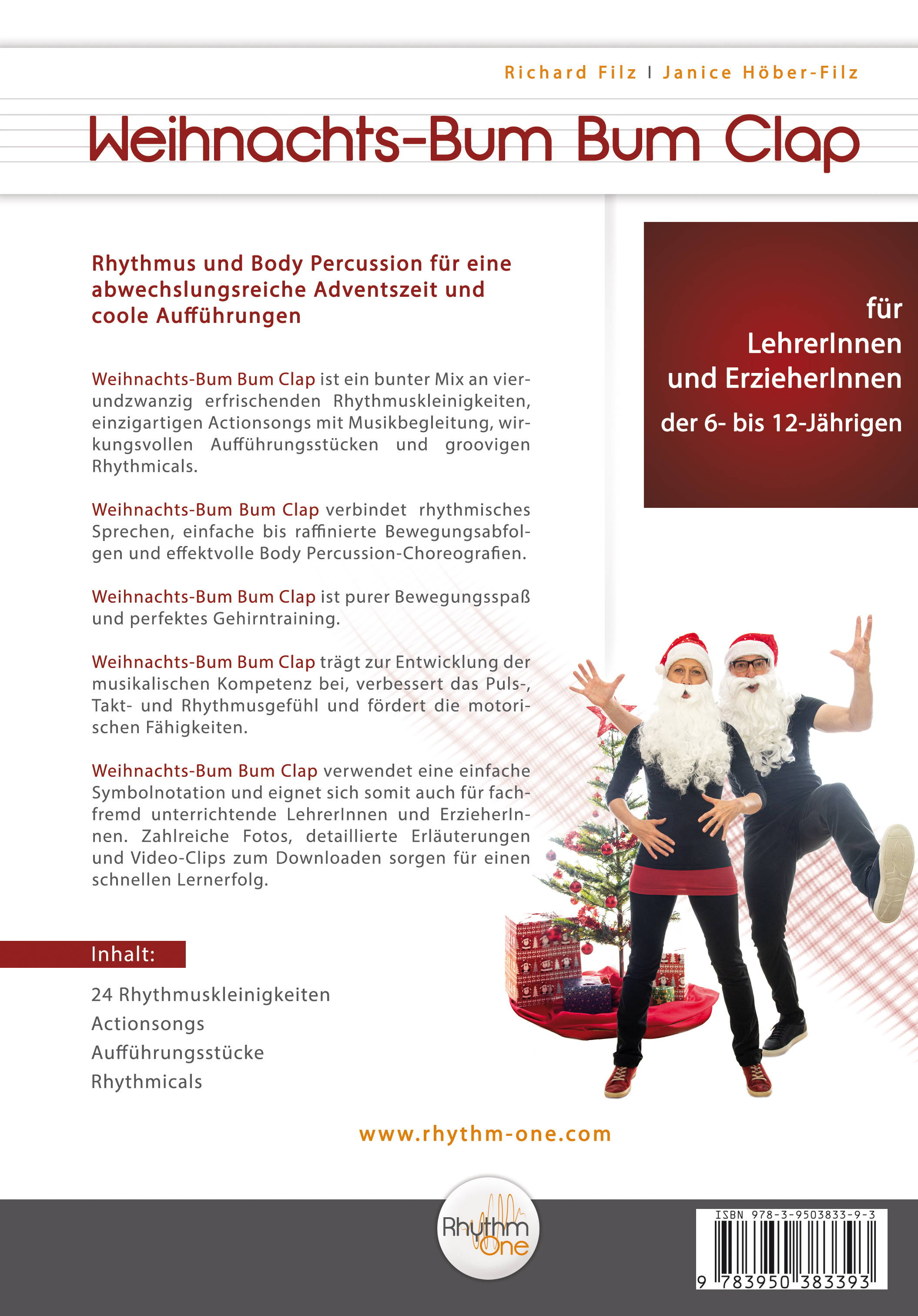 Ring! Weihnachten steht vor der Tür! Wenn Mama die Kisten mit dem Weihnachtsschmuck vom Dachboden holt, wenn die Küche zur Backstube wird und die Heimlichkeiten zunehmen – ja dann ist endlich wieder Weihnachtszeit! Mit Weihnachts-Bum Bum Clap holen Sie sich den Zauber der Adventszeit in Ihr Klassenzimmer. Die neuen und erfrischenden Ideen reißen auch den letzten Weihnachtsmuffel vom Hocker und versüßen den Kindern die Zeit des Wartens auf den Weihnachtsmann bzw. das Christkind. Weihnachts-Bum Bum Clap (WBBC) beinhaltet vier Kapitel mit vielseitigen Spielstücken rund um das Thema „Weihnachten“. Sie alle verbinden Sprechen und Body Percussion miteinander. Dabei reicht die Palette von einfach bis anspruchsvoll, von lustig bis nachdenklich, von ruhig bis rasant, von christlich bis groovig. Rudolf, schwing die Hufe! Kapitel 1 ähnelt einem Adventskalender. Die 24 Rhythmuskleinigkeiten sind ein bunter Mix an unterhaltsamen Spielideen, mit denen Sie die Kinder jeden Tag aufs Neue überraschen. Shake it, yeah, caramba! Kapitel 2 enthält drei einzigartige Actionsongs mit cooler Musikbegleitung. Diese sorgen nicht nur für reichlich Bewegung und gute Laune, sondern auch für eine unvergessliche Weihnachtsparty. Weihnachten, die schönste Zeit! Die sechs Aufführungsstücke im Kapitel 3 ermöglichen es Ihnen, zusammen mit Ihren Kindern beim Weihnachtskonzert ganz unterschiedliche „Töne“ anzuschlagen und das Publikum in vielerlei Hinsicht zum Staunen zu bringen. Weihnachtszauber! Kapitel 4 besteht aus fünf mehrstimmigen Rhythmicals. Sie begeistern durch ihren rafnierten und effektvollen Groove und runden die Sammlung an besonderen Aufführungsstücken perfekt ab. Wir sind ganz aufgeregt! Freuen Sie sich zusammen mit Ihren Kindern auf eine rhythmische Vorweihnachtszeit. Auch wenn Sie bisher keine Erfahrungen mit Body Percussion gemacht haben und Rhythmus nicht gerade zu Ihren Spezialgebieten gehört, können Sie die Ideen von WeihnachtsBum Bum Clap umsetzen, denn mit zahlreichen Technik-Fotos, detaillierten Schritt-für-Schritt-Anleitungen und den Video-Clips zum Downloaden liegt Ihnen ein Gesamtpaket vor, das Sie bei der Erarbeitung und Vermittlung der Ideen optimal unterstützt. Zudem erfolgt die Notation sämtlicher Spielaktionen mittels einfacher Abkürzungen sowie einer eindeutigen Farbcodierung, was den Zugang zusätzlich erleichtert. Sollten Sie dennoch Fragen zu einzelnen Stücken, Workshops oder Fortbildungen haben, können Sie uns gerne unter ofce@rhythm-one.com kontaktieren. Egal ob Sie mit Ihrer Klasse, Ihrer Musikschulgruppe oder Ihren Kindern im Freizeitbereich musizieren, wir wünschen Ihnen viel Spaß, Freude und Erfolg mit dem vorliegenden Material, das mit viel Liebe zum Detail erprobt und zusammengestellt wurde. Frohe Weihnachten! Schöne Ferien! Guten Start ins neue Jahr!