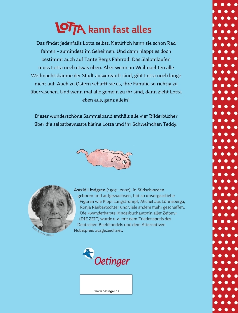 Lotta kann fast alles: pfeifen, kranken Leuten helfen, einen Weihnachtsbaum besorgen und sogar Fahrrad fahren - im Geheimen. Und nicht nur das: Lotta ist auch noch das fröhlichste Kind in der ganzen Krachmacherstraße. Es sei denn, sie ist gerade böse. Auf ihre Geschwister zum Beispiel. Aber dann zieht Lotta einfach zu Tante Berg, denn die ist immer lieb.
