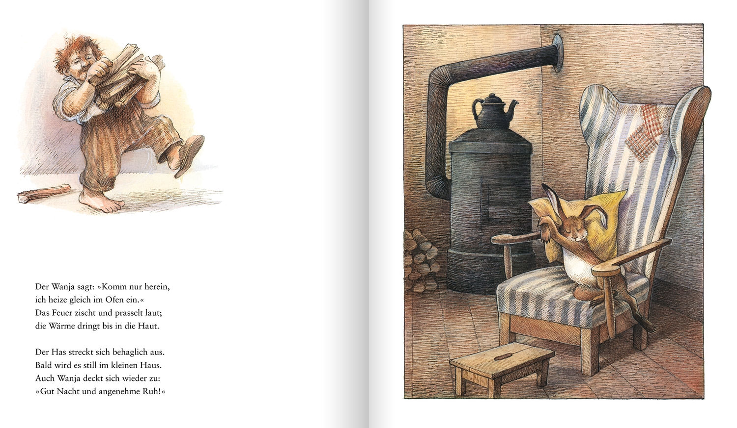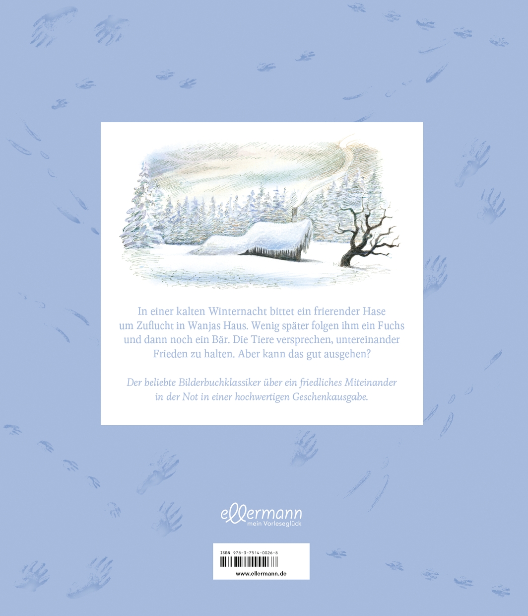 In einer eisigen Winternacht klopft es bei dem Jäger Wanja an der Tür: Ein frierender Hase bittet um Zuflucht und wird natürlich eingelassen. Doch dann folgen ihm ein wenig später noch ein Fuchs und ein Bär. Kann das gut gehen? Die Tiere versprechen Wanja, untereinander Frieden zu halten. Und als er am nächsten Morgen aufwacht, denkt er, er hätte alles nur geträumt. Doch dann sieht er die Spuren im Schnee ...