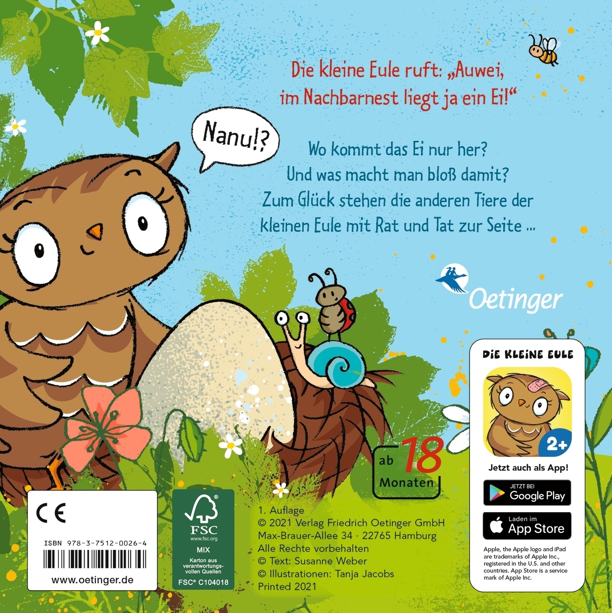 | Schlagworte | Babybuch • Baby Buch • Die Eule mit der Beule • Die kleine Eule • Die kleine Eule und ihre Freunde • Ei • erstes Vorlesen • Eule • Familie • Freundschaft • Frühling • gereimtes Pappbilderbuch • Hase • Kinderbuch ab 18 Monaten • Kinderreime • Kleinkind • Küken • Nachwuchs • Nest • Ostergeschenk Kleinkind • Ostern • Tiergeschichte • Vorlesen • Wald • Waldtiere |