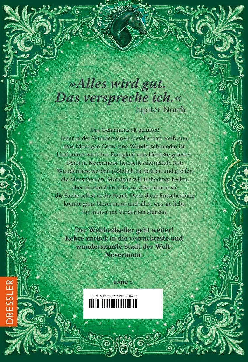 Das erste Schuljahr ist vorbei, aber feiern kann Morrigan Crow trotzdem nicht. Denn eine seltsame und hochgefährliche Epidemie bricht über Nevermoor herein. Niemand ist vor ihr sicher. Jetzt liegt es allein an Morrigan, ein Heilmittel zu finden. Doch dafür muss sie lernen, ihre Wunderschmied-Kräfte unter Kontrolle zu halten. Gelingt ihr das nicht, könnte sie ganz Nevermoor ins Verderben stürzen.