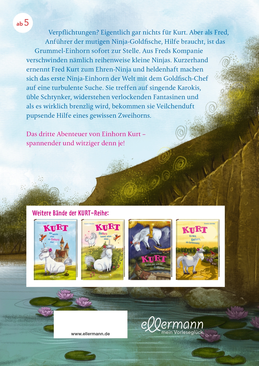 Kurt auf Ninja-Kurs: Neues vom Einhorn-Held wider Willen. Freundschaft? Verpflichtungen? Eigentlich gar nichts für Kurt. Aber als Fred, Anführer der mutigen Ninjagoldfische, Hilfe braucht, ist das Grummel-Einhorn am Start. Aus Freds Kompanie verschwinden nämlich die Ninja-Goldfische. Kurt mutiert kurzerhand zum ersten Ninja-Einhorn der Welt. Heldenhaft machen sich die zwei auf eine turbulente Suche. Brenzlig wird's, und sie bekommen Veilchenduft pupsende Hilfe eines gewissen Zweihorns. Kurzum: Kurt - grummeliger und witziger denn je!