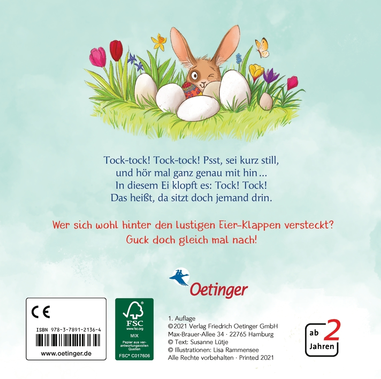 Friede, Freude, Eiersuchen - Wer hoppelt da ins Osternest? Tock! Tock! Da klopft doch was im Ei? Wer kann das nur sein? Ein fleißiger Hase lauscht an den unterschiedlichsten Eiern. Und die kleinen Leser können mit ihm zusammen die kleinen Bewohner darin entdecken. Unter den lustigen Eier-Klappen verstecken sich ein flauschiger Pinguin, ein gelbes Küken, ein Schnabeltier, ein Krokodil und eine kleine Schildkröte. Doch - pssst! - im letzten Ei ist ja gar nichts zu hören. Was da wohl drin steckt?