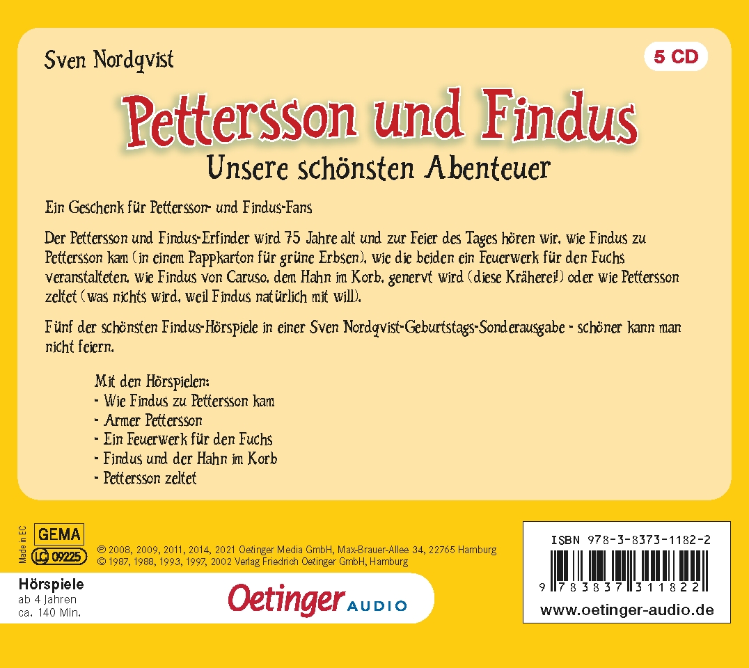 Der Pettersson und Findus-Erfinder wird 75 Jahre alt und zur Feier des Tages hören wir, wie Findus zu Pettersson zu kam (in einem Pappkarton für grüne Erbsen), wie die beiden ein Feuerwerk für den Fuchs veranstalteten, Findus von Caruso, dem Hahn im Korb, genervt wird (diese Kräherei!) oder wie Pettersson zeltet (was nichts wird, weil Findus natürlich mit will). Fünf der schönsten Findus-Hörspiele in einer Sven Nordqvist Geburtstags-Sonderausgabe - schöner kann man nicht feiern.