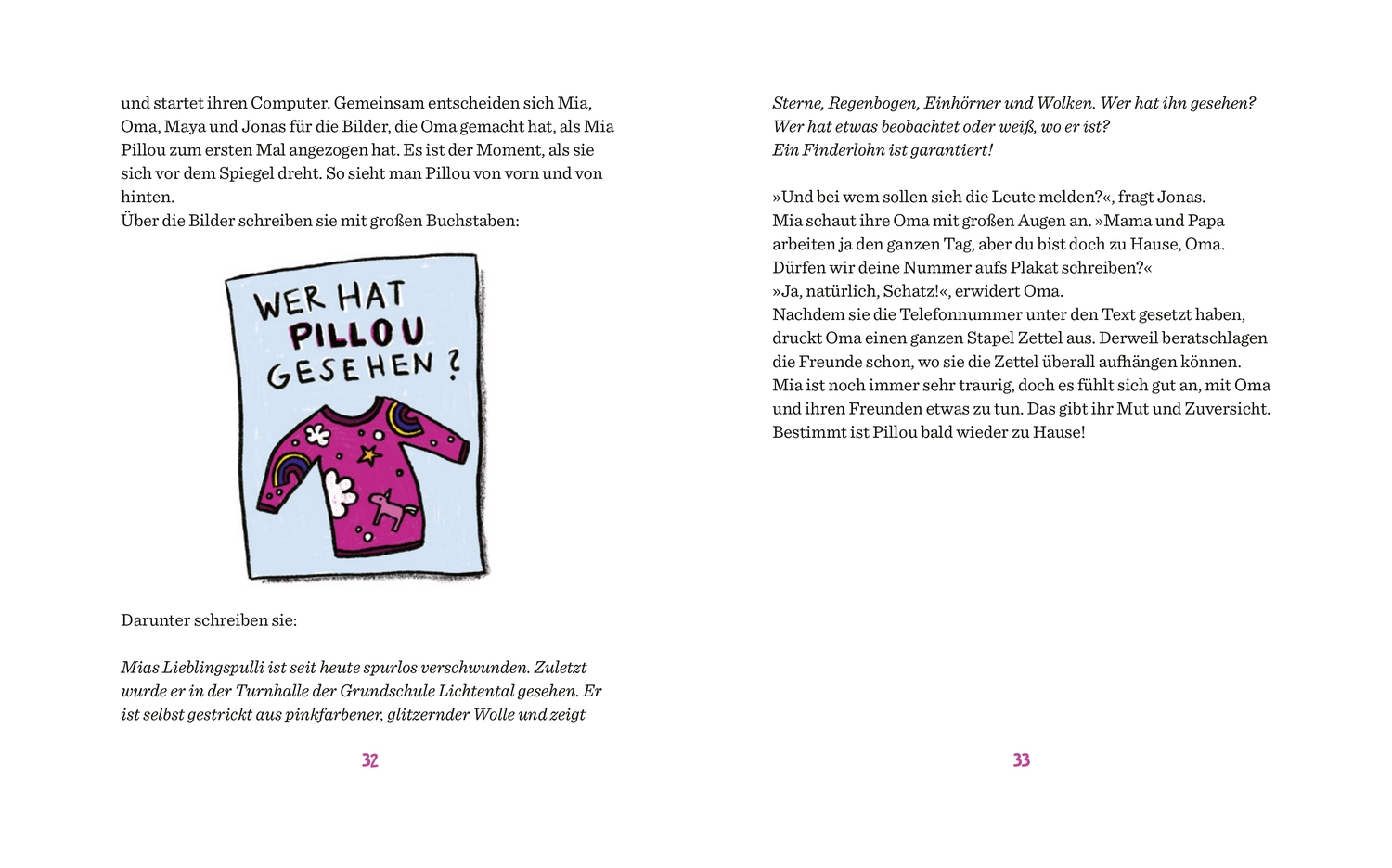Mia und Pillou, der sprechende Pullover, sind mittlerweile sehr enge Freunde geworden. Inzwischen ist es November geworden und in der Schule steht das alljährliche Krippenspiel an. Mia und Hanna interessieren sich beide für die Rolle der Maria. Als Mia die Rolle bekommt, ist Hanna sehr niedergeschlagen und wütend. Als dann Pillou nach dem Sportunterricht plötzlich verschwunden ist steht für Mia fest, dass Hanna ihn gestohlen hat. Gemeinsam mit ihren Freunden Maya und Jonas macht sie sich auf die Suche nach Pillou und dabei stoßen sie auf ein weiteres Geheimnis ...