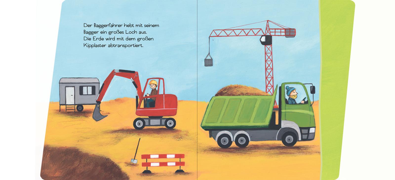 5 Doppelseiten zeigen die liebsten Fahrzeuge der Allerkleinsten: Ob auf der Baustelle oder in der Stadt, hier gibt es Müllautos, Busse, Bagger, die Polizei und die Feuerwehr zu sehen. Begleitet wird jede Seite mit einem kurzen Erzähltext, der zum Entdecken einlädt und die Fantasie anregt.