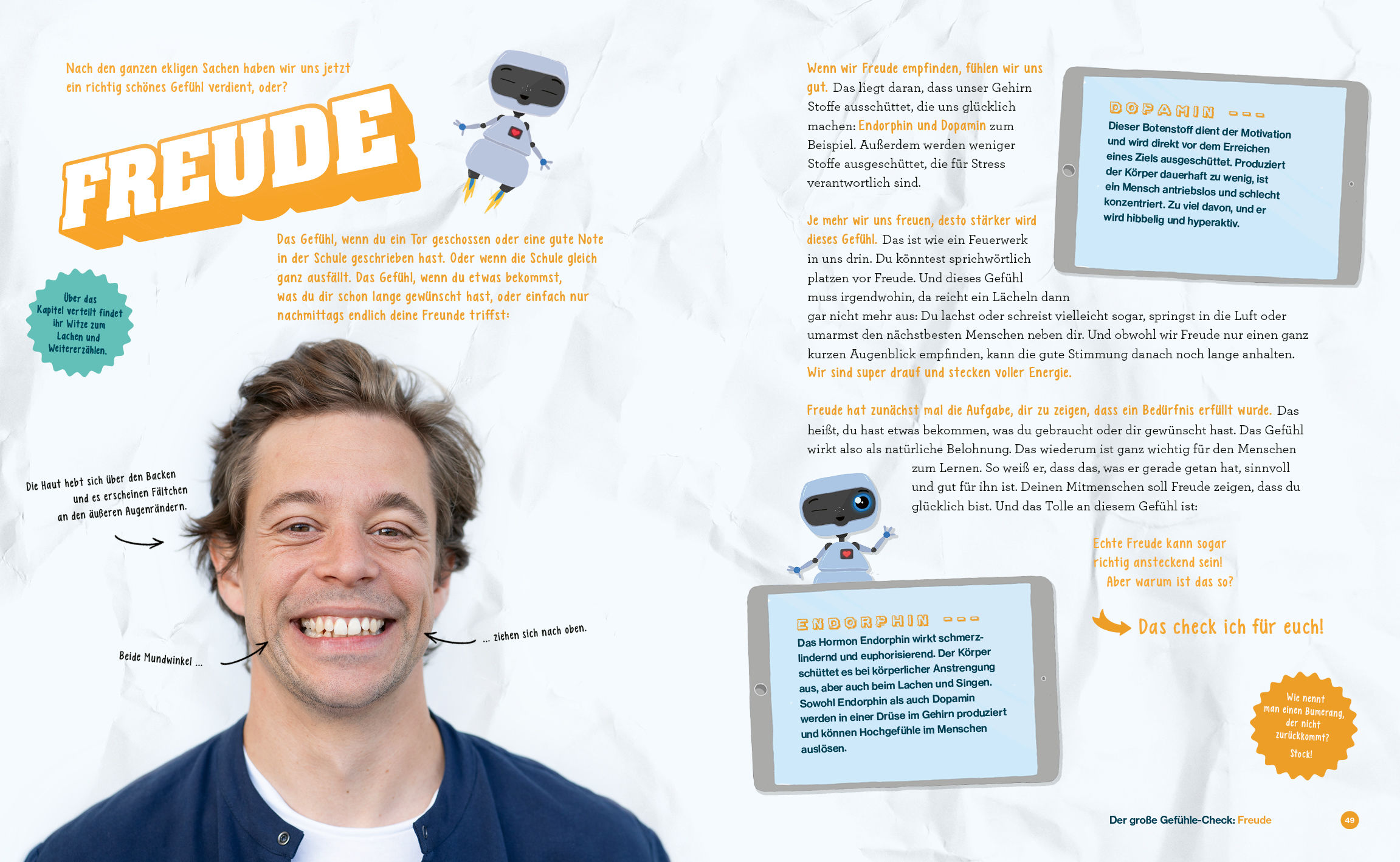 Woher kommt es, dass wir manchmal rot sehen, wenn wir wütend sind? Oder dass wir zittern vor Angst? Und dass wir am liebsten in die Luft springen würden, wenn wir uns ganz doll freuen? All diese Gefühle kennt jeder. Aber was wissen wir eigentlich darüber? Checker Tobi stellt die Checkerfragen, die Kinder interessieren. Er spricht mit Fachleuten und lässt sich die Basisemotionen erklären und was dabei in unserem Körper vorgeht. Mit vielen Fotos aus den Sendungen, Illustrationen und tollen Mitmach-Checks.Die erste Kindersachbuchreihe um und mit dem beliebten TV-Star Checker Tobi, der im gewohnten Stil jede Menge Fragen und Infos für euch checkt. Ausgestattet mit vielen Fotos aus den TV-Sendungen, coolen und informativen Illustrationen und vielen interaktiven Mitmach-Checks. Frage gecheckt!